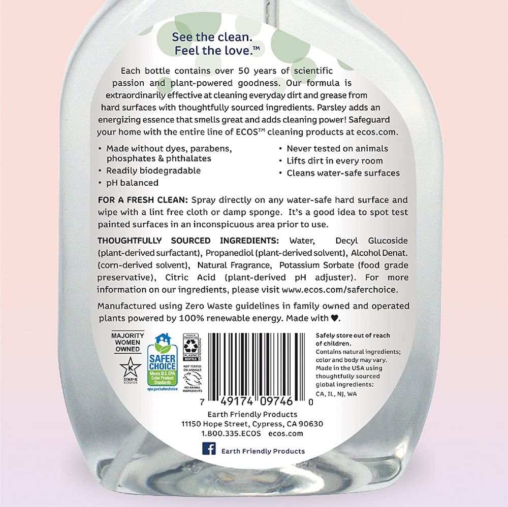 Parsley Plus from Earth Friendly Products Lifts dirt in every room Cleans water-safe surfaces Made without dyes, parabens, phosphates & phthalates pH balanced Readily biodegradable Never tested on Animals 22 FL. OZ. PACK OF 2 Ingredients: Purified water, biodegradable coconut-based surfactant, and parsley essence. Directions: Spray directly on the surface to be cleaned. Wipe with a lint-free cloth or damp sponge. Be sure to spot test all surfaces in an inconspicuous area prior to use. CAUTION: Keep out of reach of children. 100% All Natural!* 1,4-Dioxane Free. Formaldehyde Free. Petrochemical Free. Neutral pH. Does not contain SLS. *Cleaning agent derived from coconut oil.