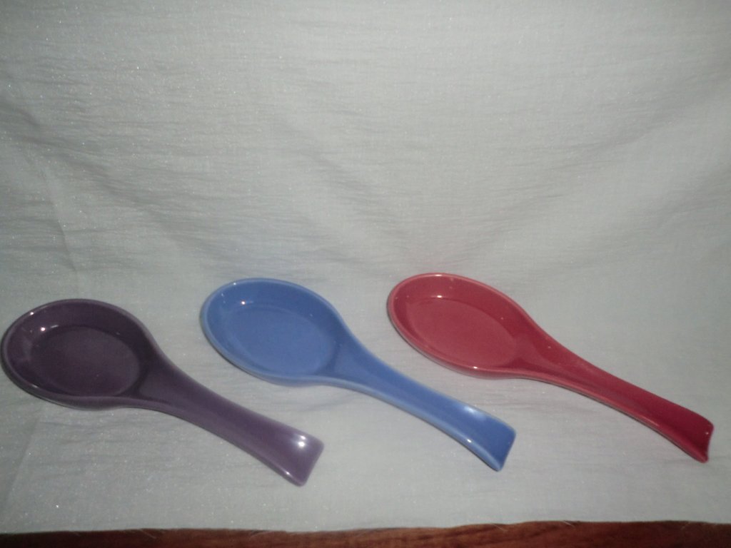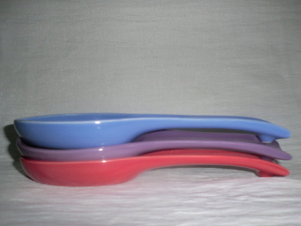 Ceramic Stove Top Spoon Cradles. Three colors salmon, purple and blue. Eight and one half inches long.