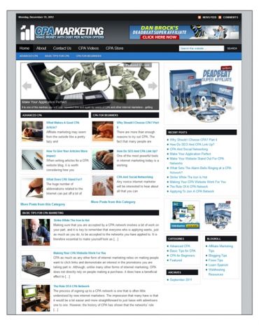 CPA blogging is a highly profitable online business. This niche blog package features a High Quality Blog on CPA blogging. With this blog package, you’ll be able to offer powerful tips to make money on autopilot from CPA based affiliate blogs. This beautiful niche blog package will make an excellent addition to your Adsense and affiliate marketing portfolio whether you are a beginner or an advanced user. This blog comes with a premium plugin that will allow you to easily install the whole blog package in practically less than five minutes. No more trouble installing Wordpress, messing with SQL files, myPhPAdmin, and messing with codes. In short, simply upload the blog package's file to your webhost, follow the three step installation and you're done! This blog comes with: Easy installation guide - Comes with 5 fully illustrated PDF Manual. Custom admin panel - Custom made admin panel to quickly and easily ad your ad codes, affiliate links, and banner promotions 40+ Pre-posted articles - These "starter" articles are already posted as part of the complete blog. PLR articles - Comes in .txt and .doc format. You have full PLR rights with this articles. You can sell, give away, and re-use any way you like. Its own logo - If you want to make the blog's logo unique for "branding" purposes, a PSD file is included for easy editing.