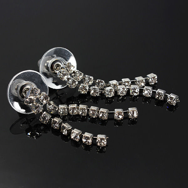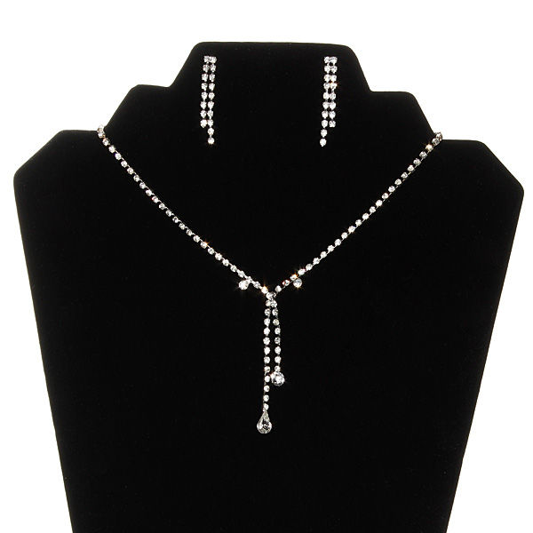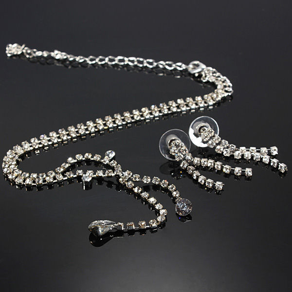 Bridal Tassel Drop Crystal Necklace Earrings Jewelry Set PRODUCT DESCRIPTION: Item Specifics: Material: Zinc Alloy, platinum plated, crystal Pattern: Tassel Drop Crystal Style: Wedding Setting: Square Crystal Feature: Adjustable Gender: Women Color: Sliver Necklace Length: App 34cm+9.5cm Earrings Length: App 3.4cm/ 4.1cm Weight: About 26g Quantity:1XNecklace,1Pair Earrings Package Includes: 1 x Tassel Crystal Jewelry Set Note: Due to the difference between different monitors, the picture may not reflect the actual color of the item. Please consider this before the purchase.