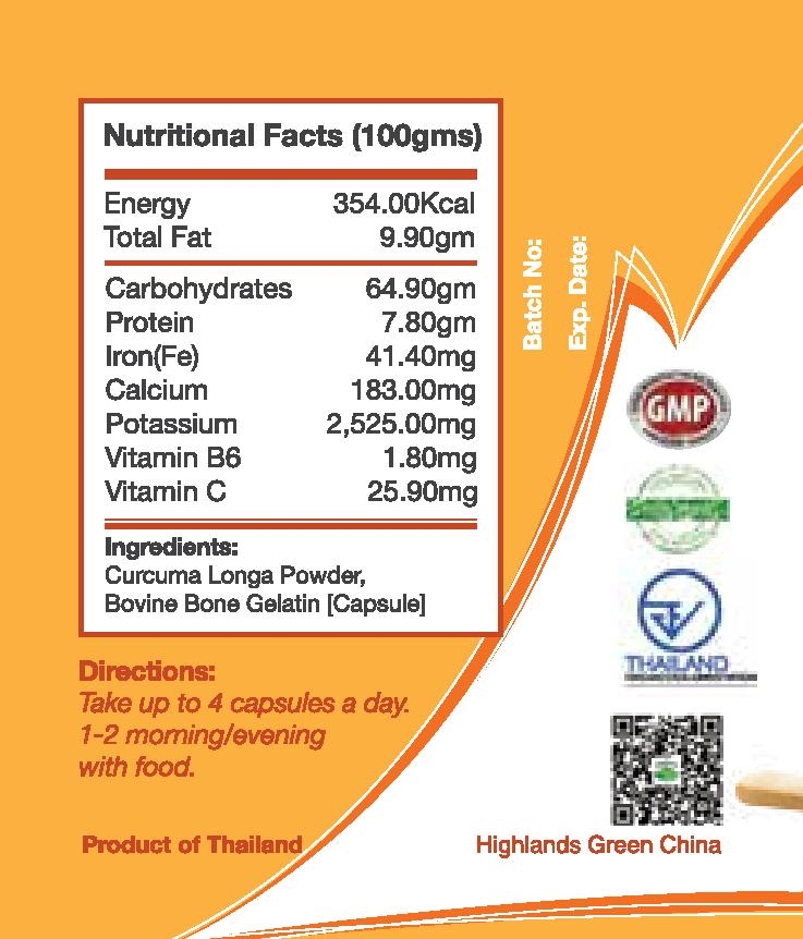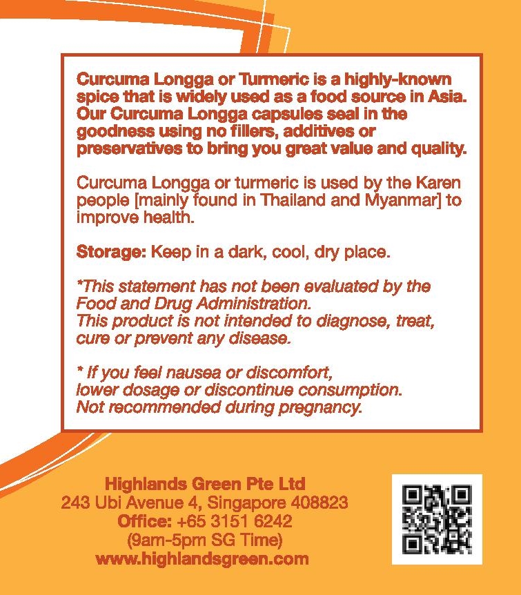 Highlands Green Curcuma Longga Powder Capsules Curcuma Longga or Turmeric is a highly-known spice that is widely used as a food source in Asia. Our Curcuma Longga capsules seal in the goodness using no fillers, additives or preservatives to bring you great value and quality. *This statement has not been evaluated by the Food and Drug Administration. This product is not intended to diagnose, treat, cure or prevent any disease. *If you experience nausea or discomfort, lower consumption or discontinue consumption. Not recommended during pregnancy. Dosage: 1 to 2 capsules, morning and evening with meals. Do not take more than 4 capsules a day. Start with one capsule a day and increase if no ill effects such as nausea or diarrhea.