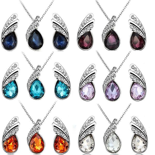 Item Specifics: Material: Metal, Silver Plated Main Stone: Crystal Color: Rose Red, Orange Red, Light Blue, Dark Blue, Dark Purple, Light Purple.White Pattern: Water Drop Gender: Women Necklace Circumferece: App 42cm + 5cm Pendant Size: App 2.5cm x 1.3cm Earring Length: App 1.7cm Weight: App 17g Package Includes: 1 x Crystal Water Drop Jewelry Set (Please choose the one you like) Notice: 1.Due to the difference between different monitors, the picture may not reflect the actual color of the item. Please consider this before the purchase. 2.Please allow slight deviation for the measurement data.