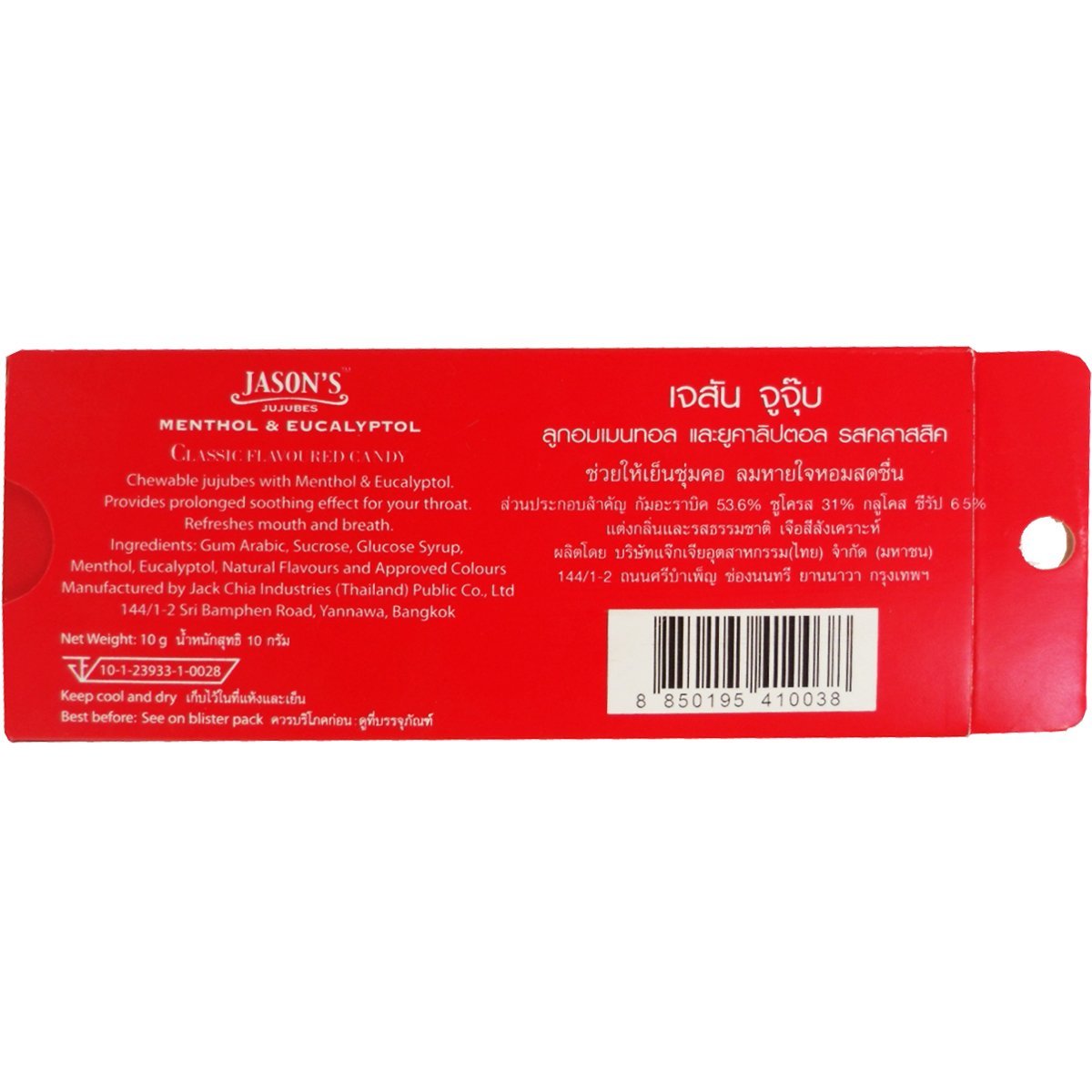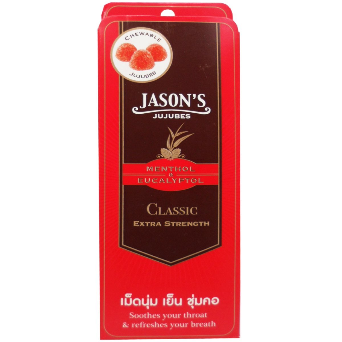 Chewy Candy Classic Flavoured with Menthol Eucalyptol Jason's Jujubes Provides prolonged soothing effect for your throat Refreshes your breath Delicious Chewy Candy with Classic Menthol Eucalyptol Flavoured. Soothes your throat & refreshes your breath. Product of Thailand.(Ships from Thailand) Net Wt 10 G (10 Pieces)