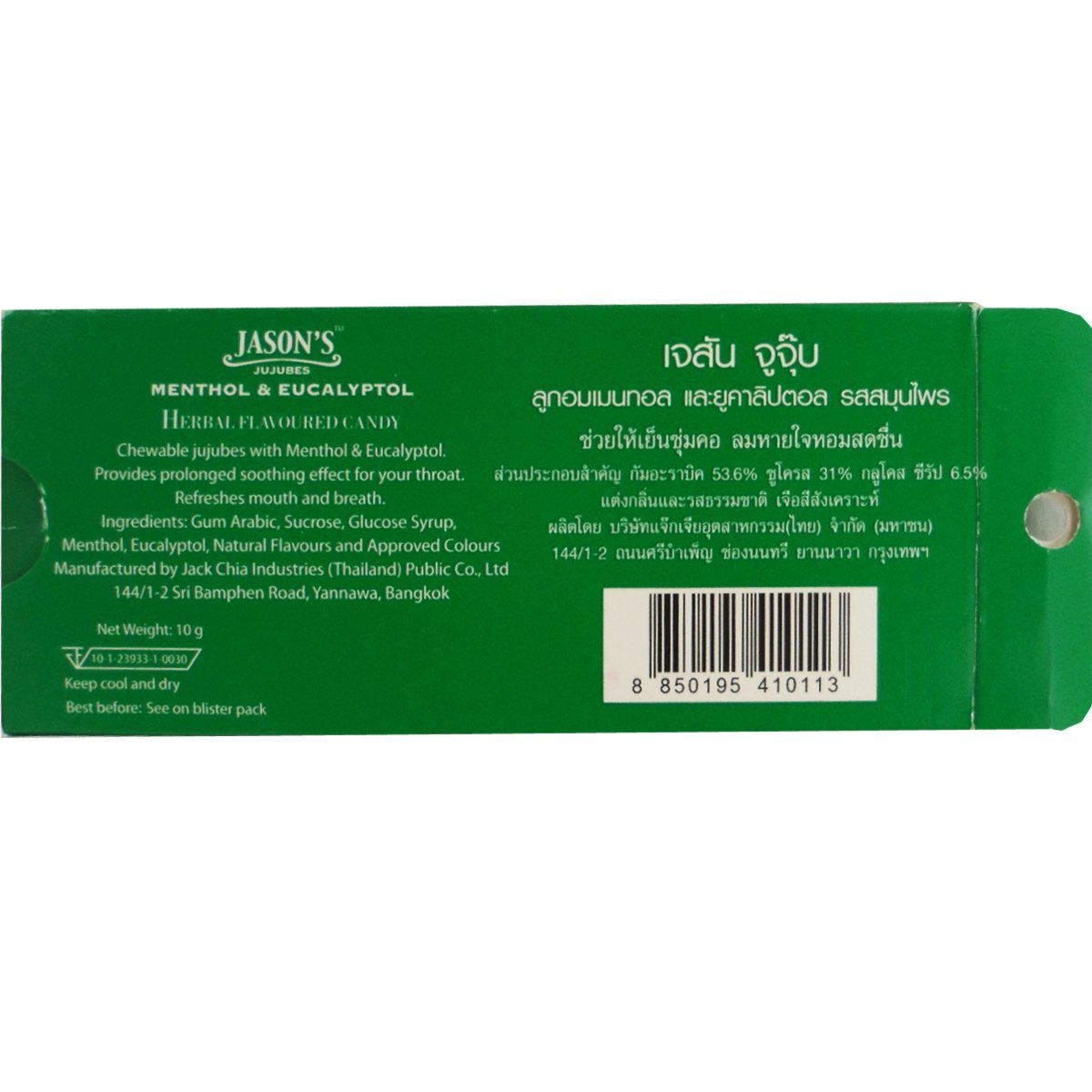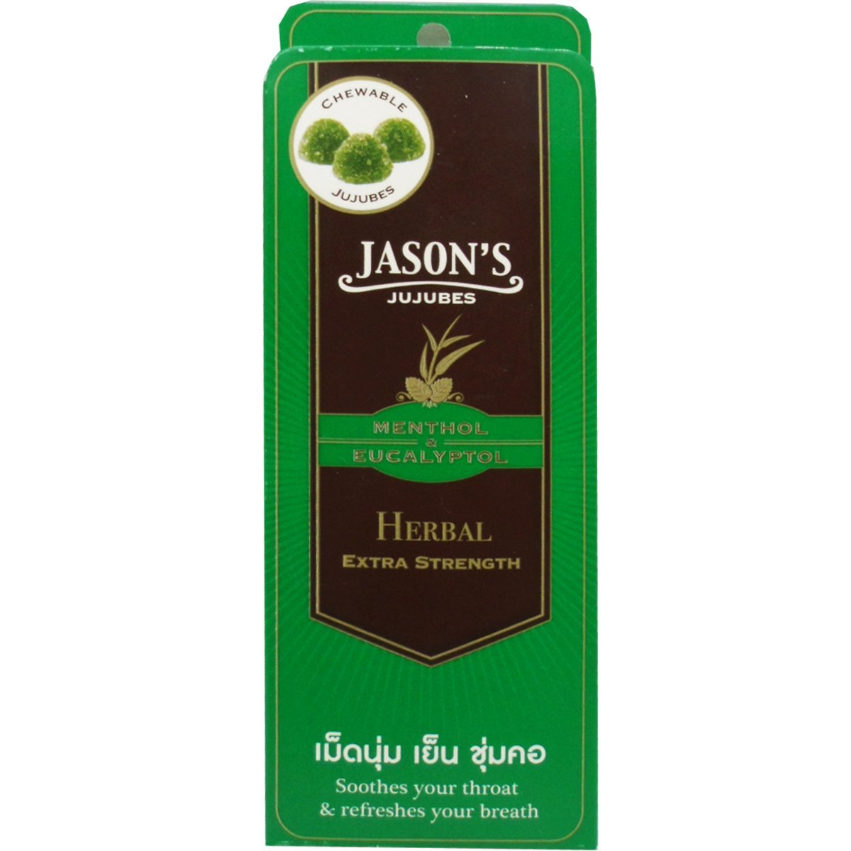 Chewy Candy Herbal Flavoured with Menthol Eucalyptol Jason's Jujubes Provides prolonged soothing effect for your throat Refreshes your breath Delicious Chewy Candy with Herbal Menthol Eucalyptol Flavoured. Soothes your throat & refreshes your breath. Product of Thailand.(Ships from Thailand) Net Wt 10 G (10 Pieces)