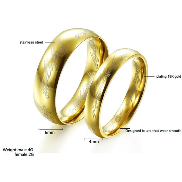 Description: Type: Gold Plated LOTR Ring Material: Stainless Steel Plating: 18K Gold Plated Pattern: Carve Letter Style: Trendy Gender: Unisex Color: Gold Female Size(US): 6#, 7#, 8#, 9# Male Size(US): 8#, 9#, 10#, 11# Weight: About 4g Size Details: Size 5 6 7 8 9 10 11 Diameter(mm) 15.8 16.4 17.0 18.2 19 19.8 20.7 Perimeter(mm) 50 52 54 57 60 62.5 65 Package Included: 1 X Gold Plated LOTR Ring (Please choose the one you like) Notice: 1.Due to the difference between different monitors, the picture may not reflect the actual color of the item. Please consider this before the purchase. 2.Please allow slight deviation for the measurement data.