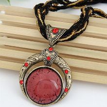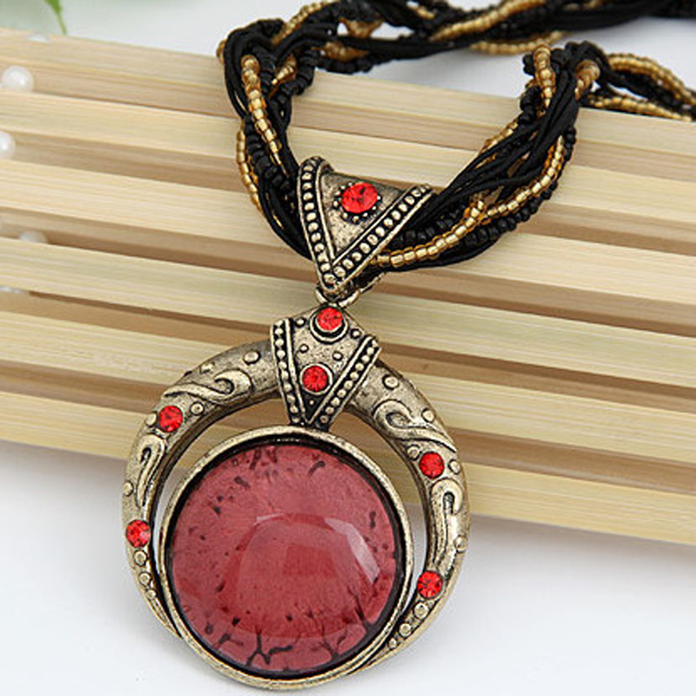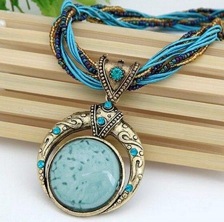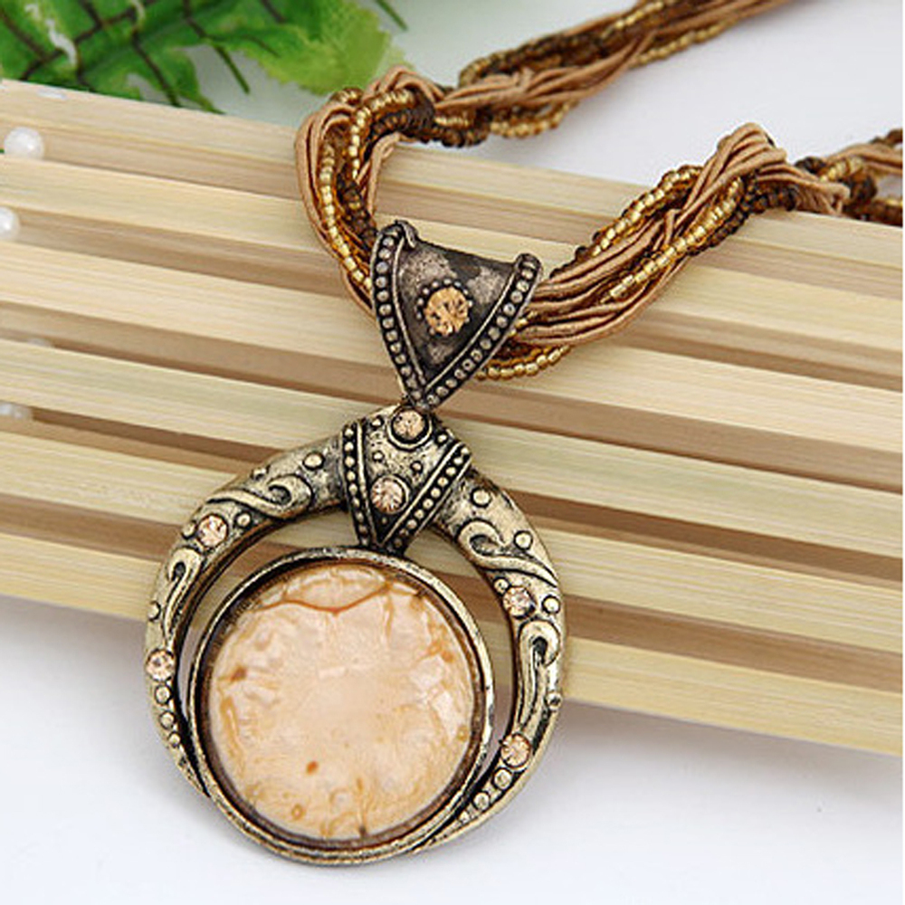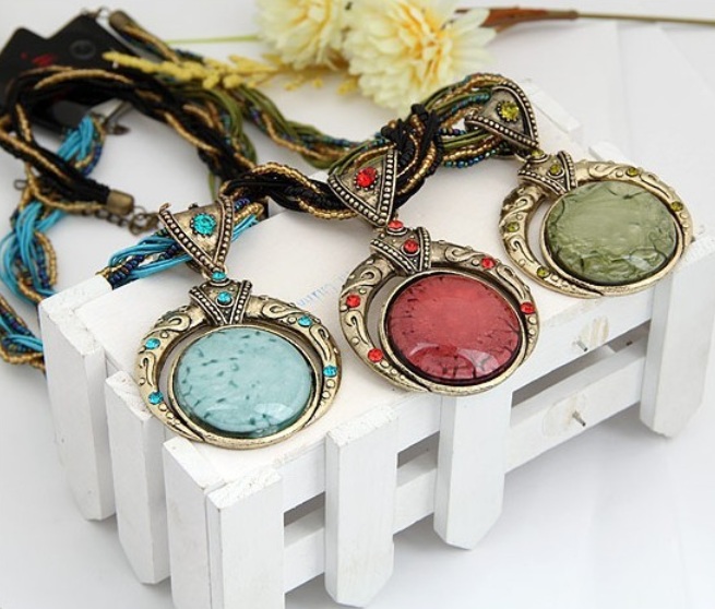 100% Brand New! Gender: Women Necklace Type: Pendant Necklaces Metals Type: Zinc Alloy Chain Type: Rope Chain Material: Stone Length: 40cm Style: Bohemia Shape\pattern: Round Pendant Size: 7.6cm*5.0cm Weight: 45g Colors: Green, Red, Blue, Beige