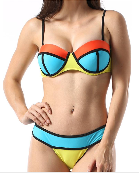 Women Mixed Color Block Neoprene Push Up Triangle Underwire Bikini Sets Swimwear