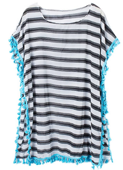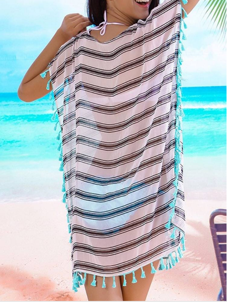 Women Chiffon Tassel Cover Up Stripe Printed Shirt Outfit Beach Wear