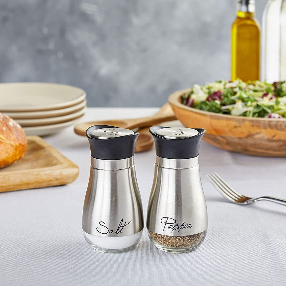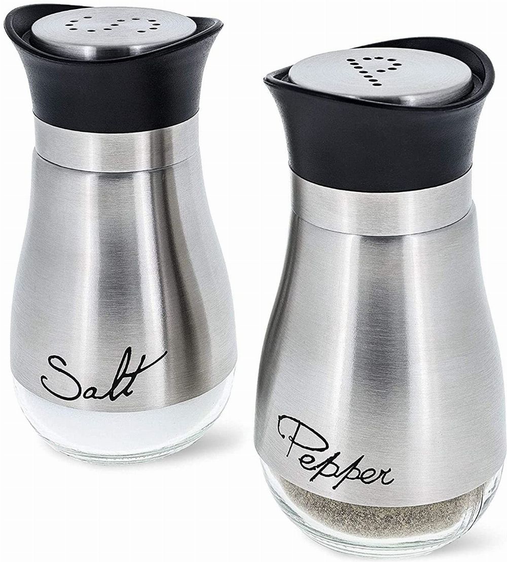 The Juvale 4 inch Salt and Pepper Shakers are a great addition to any kitchen or dining room table. Each salt and pepper shaker is 4 inches tall and holds about 4 ounces. Made from high quality stainless steel with a glass bottom that helps to verify when shakers are getting low, avoiding the hassle of constantly removing the cap. Each shaker is clearly labeled in an elegant font.