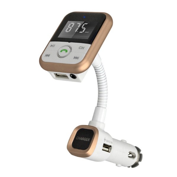 100% Brand New! FEATURES: 1. Wireless transmit phone call from Bluetooth mobile phone to the car FM stereo system. 2. Built-in FM transmitter, full frequency: 87.5-108.0MHZ. 3. With built-in microphone and automatically calling-number system 4. Supports USB disk and SD card,A2DP function 5. With 3.5mm line-in jack, support external audio devices. 6. Switch to Hands-free mode automatically from music playing status when receiving calls 7. Supports 4 loop modes: Repeat all, Random, Repeat one, Folder, 8. 5 EQ for optional: Natural, Rock, Pop, Classic, Jazz 9. USB charging port for charging iPod/ iPhone, iPad and other mobile device. (output: DC 5V/2.1A). 10. Support 12-24V voltage from the car cigarette lighter. 11. Strong and elegant design with LCD screen display, just support number displaying. 12. Flexible metallic hose adapted for any type of autos. 13. With infrared remote control, easy operation SPECIFICATIONS: BLUETOOTH IC: CSR BC8635 Stereo (CSR 4.0) Frequency: 87.5-108.0 MHZ Frequency Stability: ±10ppmI (0°C-+45°C) Output Frequency: 20HZ-20KHZ Supply Voltage : 12-24V USB Charger output: 5V/2.1A Music Format: MP3 Format USB (Maximum support): 32GB SD (Maximum support): 32GB Transmit Distance: >10M Operating system: Win xp/Win vista/Win7 MP3 S/N RATIO: 60-70dbm MP3 BITRTE: 32KPB-320KPBS SNR:=80dB Product Size: Approx. 7.9 x 3.9 x 1.6 inches Product Color: Gold Using FM Transmitter function: 1. Plug the FM transmitter into your vehicle's cigarette lighter or power port. 2. Tune your radio to an unused FM frequency, then match the same frequency of this unit. 3. Insert a USB flash drive or SD card which containing MP3 files into USB port or memory card slot of this unit accordingly. It will play and transmit the MP3 files automatically. 4. Line-in function: Use the provided audio cable to connect an MP3/MP4 players or another external device to the AUX input of this unit. When using this function, please stop playback of USB or memory card, and all functions will be controlled by the external device. Using Bluetooth function: 1. Using Bluetooth for the first time, you need to pair your mobile phone with this unit. Activate your mobile phone's bluetooth function, then search new device. When the mobile phone detects this unit (named as "BT67"), please pair and connect by using the original password "0000" 2. In the music playing mode, when there is an incoming call, this unit will automatically switch to telephone mode. Note: The Bluetooth indicator light which on the top of the screen will be stop flashing after the Bluetooth connected with your mobile phone. Bluetooth calling: 1. Please press the red "Answer/Hang off" button in the middle of the keyboard to answer the incoming call. 2. Please press the red "Answer/Hang off" button in the middle of the keyboard to hang off a call. 3. When making a call, you can only dial the phone number by your mobile phone, but once the call connected, you can use the hands-free function to enjoy it. Note: The Bluetooth indicator light which on the top of the screen will be flash quickly when talking. Using USB charger function: When this unit powered from car lighter socket, connect the USB Charger port to your mobile phone with a special USB cable (not included). This unit will serve as mobile phone charger. Remote controller: Most of the function can be fulfilled by the remote controller provided. Package include: 1 x Bluetooth FM Transmitter 1x Audio Line 1x Remote control