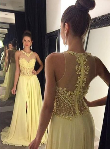 Elegant Sheer A Line O Neck Chiffon Beading Long Evening Dresses