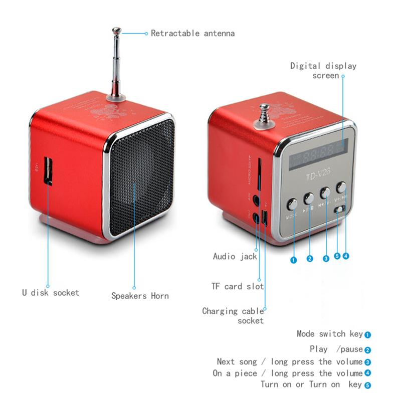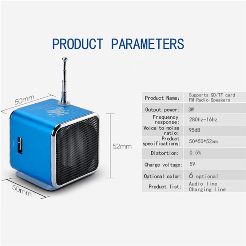 This mini speaker supports Micro SD/TF card, USB disk, FM, it is stylish, compact, portable and convenient to carry. With it you can enjoy music anytime anywhere. Specification: SNR: >80db Color: Pink ,Bule,Red,Green,Black,Silver Music format: mp3 Material: aluminum alloy Power source: Li-ion battery / DC5V Built-in rechargeable battery Support : Micro sd/tf card/usb/disk/fm Usb 2.0 high speed transmission,fully compatible with usb1.1 line in function,receiving the audio source from mp3/mp4/pctebook/ipod/iphone Function buttons: on/off, menu, previous song, next song, play /pause, volume control Package Included : 1 x Mini Portable USB Speaker 1 x 3.5mm Plugs Cable With USB Charge