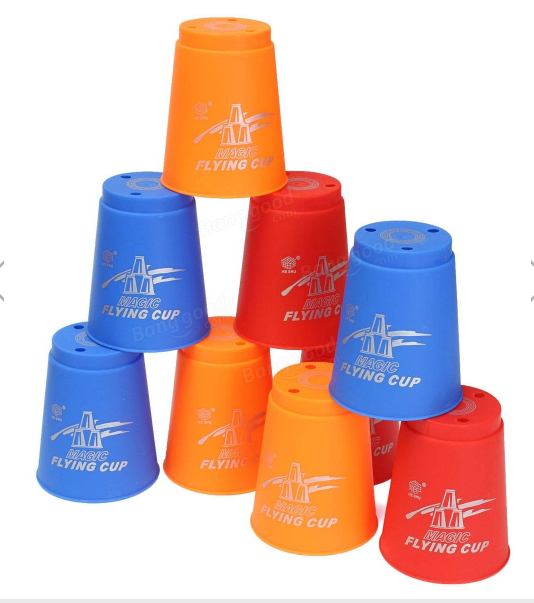 We've got our own set of professional stacking cups here, made from a strong plastic that won't crumple, but is light enough for speedy stacking attempts