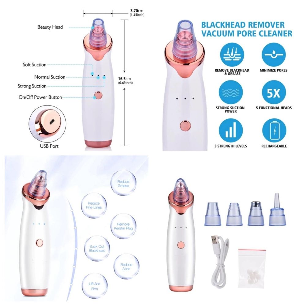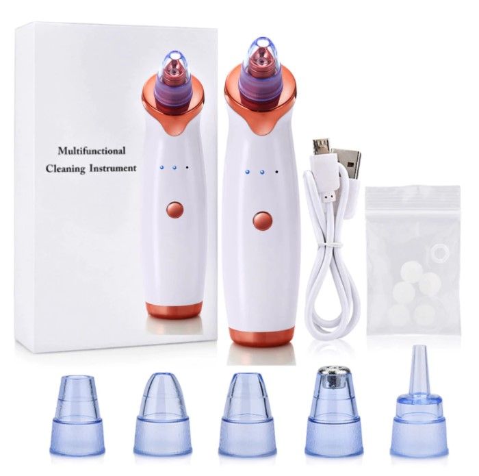 Products Function: Can be used to remove blackhead, acne and clean face deeply and it is suitable for treating dry skin, sagging skin, dull skin and also wrinkles, increasing blood circulation in the skin. Comes with 5 changeable beauty heads, which can offer different functions and offer a deeper clean for your facial skin.Many Levels adjustable suction makes it suitable for different skin. Helps remove the pores, blackheads, wrinkles on your face and keep your skin clean, making skin smooth to be rejuvenated Description: Color: White Rose Gold Material: ABS Function: remove blackheads, shrink pores, skin care Charging method: USB cable Instructions: 1. Apply a hot towel or blackhead to the skin of the face, keep it for 5-10 minutes, open the pores and soften the skin; 2. Select the tip you need and install the tip on the main unit; 3, Slowly moving on the skin of the face, please do not stay in the same position for too long, to avoid skin red and purple; 4. After cleaning, wash with cold water, apply mask, use emollient products properly, keep your face moisturized Notes: 1.The real color of the item may be slightly different from the pictures shown on website caused by many factors such as brightness of your monitor and light brightness. 2. Please allow slight deviation for the measurement data. 3.Thanks for your understanding Packing list: 1Pcs* beauty instrument 1Pcs*USB cable 5Pcs* replacement head