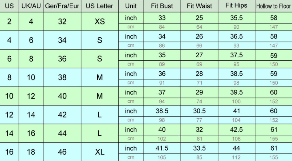 Size: US / UK / EU Size 2 4 6 8 10 12 14 16