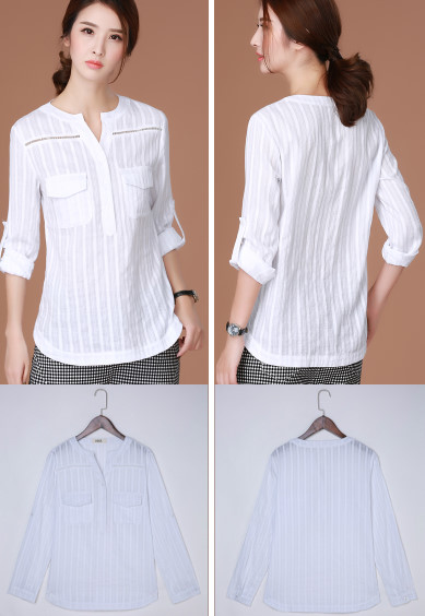 Sleeve Length: Full Pattern Type: Striped Fabric Type: Broadcloth Style: Formal Collar: Stand Decoration: Button Clothing Length: Regular Sleeve Style: Regular Material: Polyester Gender: Women Sleeve: Long sleeve pattern: Solid color Year season: 2016 summer Color classification: white Size: M L XL