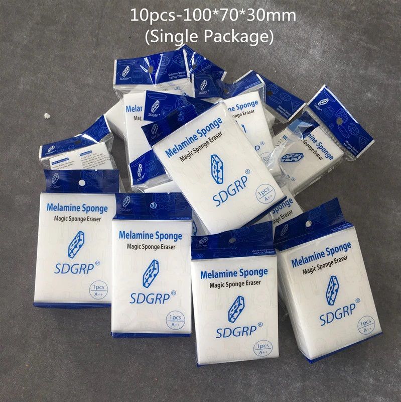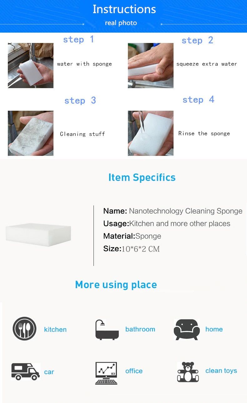 5/10/20/40Pcs Melamine Magic Sponge Eraser Cleaner Cleaning Sponges Material: Melamine foam Color: white Quantity: 10pcs Item size:   100mm X60mmX20mm Package Includes: 10x Cleaning Magic Sponge Eraser Melamine Cleaner   100% New And High Quality!! Description: Material:Sponge Color:White SIZE:100mm X60mmX20mm/100mm*70mm*30mm Household goods : tea sets , dishes , plastic , glass, sofa , shoes , sneakers , walls,Floor, switch panel , doors, windows , tables and chairs , children's toys .Appliances : telephone, air conditioning , refrigerators , fans , rice cookers , microwave ovens , washing machines and so on. Toiletries : mirrors, countertops, tub, tiles, toilet . Metal appliances: faucet , sink , washing vegetables dish , pendant handles . Office supplies: computers , telephones , fax machines , copiers , tables, chairs , cabinets , and so on.Car Accessories : leather seats , auto glass , automotive front .This sponge removes stain/dirt with water.Good for Sink, Bathroom, Stainless steel appliances, Bath tubs and basins,Ceramic tiles, Plastic, Painted walls and doors, Leather, And other scribbles of home floor. This sponge can be cut into any size for a suitable shape and it's a strong multi-functional cleaner. The magic eraser instantly removes stains without detergent It simply makes dirt disappear and brings lots of conveniences to you How to use: Soak sponge in the water , then squeeze eraser to remove excess water. Gently rub sponge over dirt, smudges and scuff marks. Rinse eraser between uses. Note: 1. Do not scrub to hardly. it may a reason of sponge break. Before use test a non visible section of the surface to be cleaned. 2. Do not use for Glossy(Waxing), polished surface like Car,Monitor Screen and other. 3. Do not rub in skin or on animals.(Recommend to use gloves when you use it) 4. Do not ingest. (if ingested seek immediate medical attention) Caution:- Do not ingest (seek medical treatment if ingested)- Cut off the power if used on electric appliances 5/10/20PCS X Magic Sponge Size:10*6*2cm
