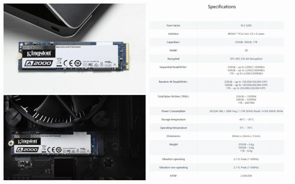 kingston M.2 2280 PCle A2000 SSD NVMe PCIe performance is provided at a much lower cost Support full security suite (TCG Opal, XTS-AES 256-bit, eDrive) Ideal for ultrabook and small PC (SFF PC) systems Upgrade your PC with up to 1TB2 storage capacity *3D NAND *XTS-AES 256 bit encryption *TCG Opal *IEEE 1667 / eDrive security About real capacity 120GB = approximately 108GB-114GB 250GB = approximately 225GB-237GB 500GB = approximately 450GB-475GB 1000GB = approximately 900GB-950GB It is calculation difference between manufacturer and your PC. Your PC says 1GB = 1.073741824 Billion bytes where Market Defines 1 GB = 1.00 Billion bytes. Please Google “ssd real capacity” to get more information. The person pursuit of perfect is not recommended to buy. SSD Buying Tips 1:Our speed test is on the right interface 2:Real capacity: different of factory and electronic produces to lead a capacity differentce, available capacity will be about 90%-93% 3:As different platform or software, the result will be a little difference(ATTO /AS SSD) Shipping Notice (before you order) 1:When you make order in our store its means your shipping address is valid ,phone number is valid ,if it is written incorrectly please kindly make a note on the order or contact us to change in the first time ,then your parcel will be sending with no error. 2.All of the products are 100% original, and the appearance is in kind. 3.When the post contact, please check the package and the product condition well, and make a unpacking video (if you need proof lately) to help to protect your benefit .Thanks much For Russian Buyer: Russian policy, please send us ([email protected]) your full name (written in Russian) and passport number. **IMPORTANT from returns&refunds: We only ship factory-packaged and tested products, 100% working. We are not responsible for improper handling or installation by the customer. In that case, we do not accept complaints and do not resend the goods. When you place the order, it means that you have read and agreed with all the above terms and instructions. Thanks.