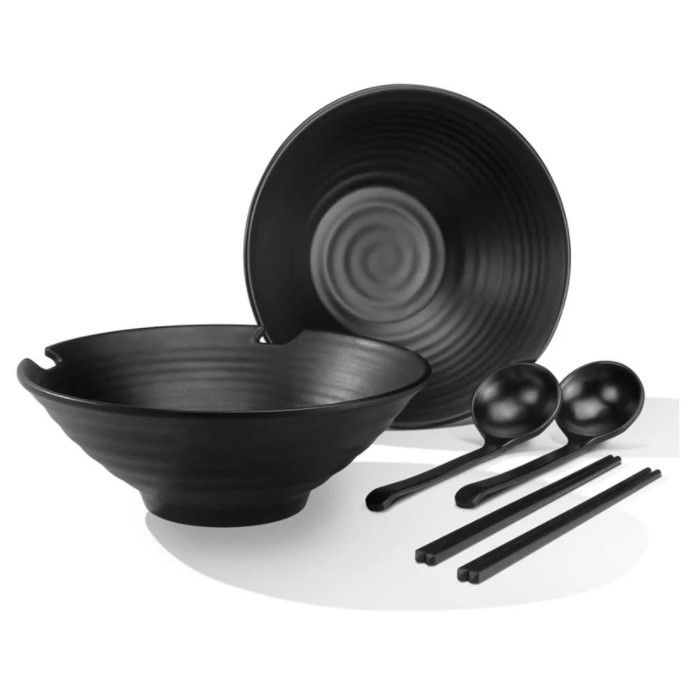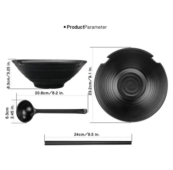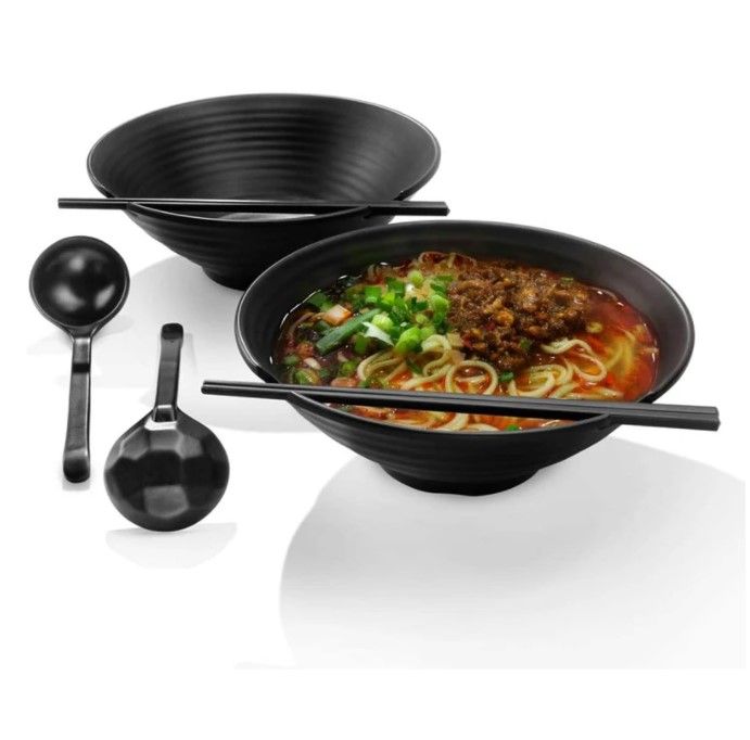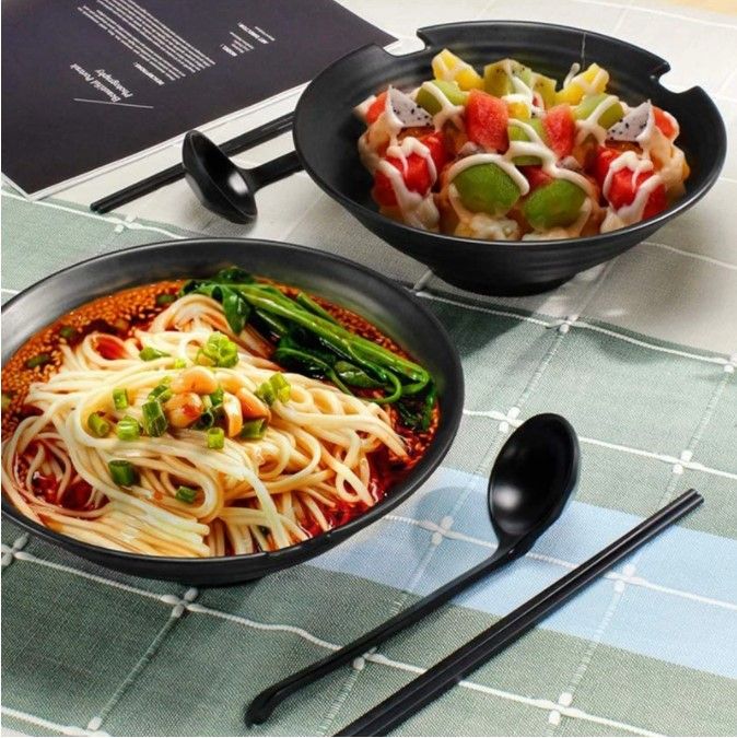 The ramen bowl is lightweight, unbreakable, they are drop resistant, unlike ceramic, glass or porcelain. It will last you for years Unbreakable. UNIQUE DESIGN : Creative design there are two grooves on the surface of the bowl to prevent the chopsticks from sliding off, The main part adopts non-slip thread design. PERFECT COOKER : Multifunctional bowl is suitable for home kitchen use, perfect for for salads, desserts, fruit, pasta, pho asian, Pasta, Udon Soba, Noodle, Rice etc. Dishwasher Safe. GIFT COLLECTION : this bowl is Perfect for dinner parties, as well as for everyday dining, Mix and match with square and rounded plates, cups and other tableware to complete your dining collection. size:23x8cm Material:Melamine colour:Black Package Contents: 2 x Cereal Bowls 4 x Chopsticks 2 x Spoon Only the above package content, other products are not included. Note: Light shooting and different displays may cause the color of the item in the picture a little different from the real thing. The measurement allowed error is +/- 1-3cm.