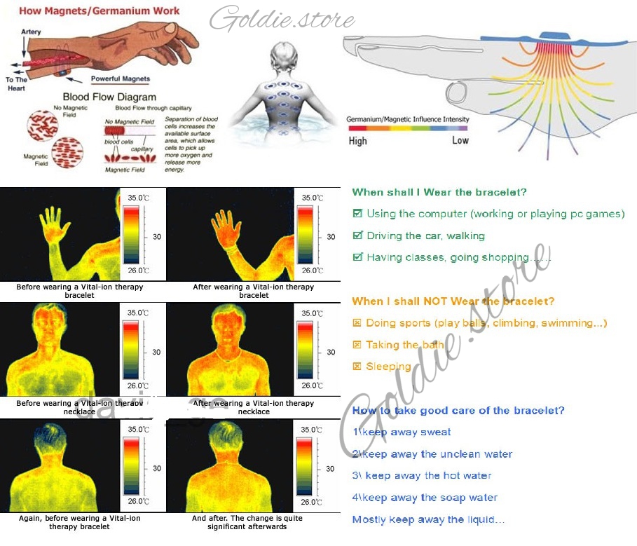 Black 80 Germanium Titanium Energy Bracelet Power Bnagle Pain Relief man & women Features: Promote blood circulation, enhance metabolism Prevent mental fatigue, Tranquilize the mind Renew our balance and strength, promote body flexibility Reduce muscle tension and increase flexibility - Injury prevention. Reduce fatigue and tension and thus enhance the ability to perform at optimum level Specification: Material:316 Stainless Steel,Germanium Stones Ball Length:20.5cm Weidth:0.8cm Weight:26g Who should wear this product? If you have to use a computer or mobile phone for a long period of time If you have to keep focused on your work for a long period of time If your job requires you to stand or do laborious work for a long time If you are a person who always has cold hands and cold feet If you are weakly resistant to illnesses and catch colds easily If you have a stressful life style and want to relax and regain your energy If you have an irregular life style and are often sleepless. Benefits * Reduce muscle tension and increase flexibility - Injury prevention * Reduce fatigue and tension and thus enhance the ability to perform at optimum level * Improve blood circulation * Alleviate Discomfort and improve sleep Thermography Tests As can be seen from the thermography tests below - Vital-ion negative ion necklaces and bracelets significantly enhance the wearer's circulation. This increase in circulation may assist with the body’s ability to recover from injury and may assist those who suffer from poor circulation. Of course, anyone wearing a Vital-ion necklace or bracelet may also enjoy the benefits from an improved circulation and a speedier recovery. Package Include: 1 X Health Bracelet In a Gift Box ***If you have any question, please email us. Customer satisfaction is very important to us! Please contact us before leaving any negative or neutral feedback or dispute on Paypal because it will hurt both of our benefit. Please give us the opportunity to resolve the problem. We understand the concerns and frustrations you might have, and we will try our best to resolve the issues.