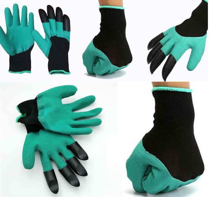 Garden Gloves with 4 ABS Plastic Claws for garden Digging & Planting Description : Do you still worry about your nails when you are digging? Digging gloves make gardening fun and easy. With built in claws for digging, planting and raking, these garden gloves are a one step solution to your gardening tasks. The gloves are puncture resistant and the claws are made with durable ABS plastic to protect your fingers and hands. It's waterproof, keeping your hands dry and clean. Specifications : Material : Rubber, Polyester and ABS Plastic Color : Green and Black Waterproof  : Yes Packaging Details Unit Type: piece Package Weight: 0.09kg (0.20lb.) Package Size: 23cm x 22cm x 21cm (9.06in x 8.66in x 8.27in)