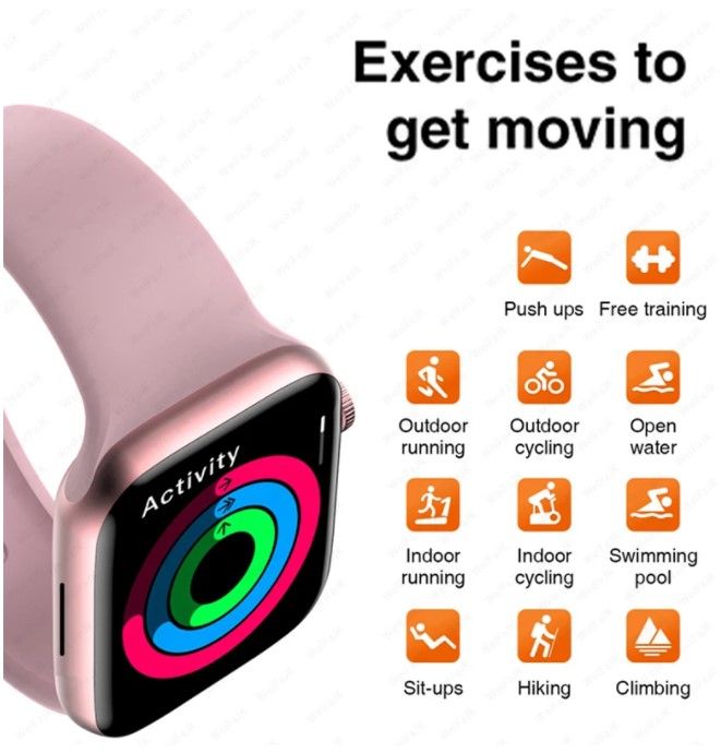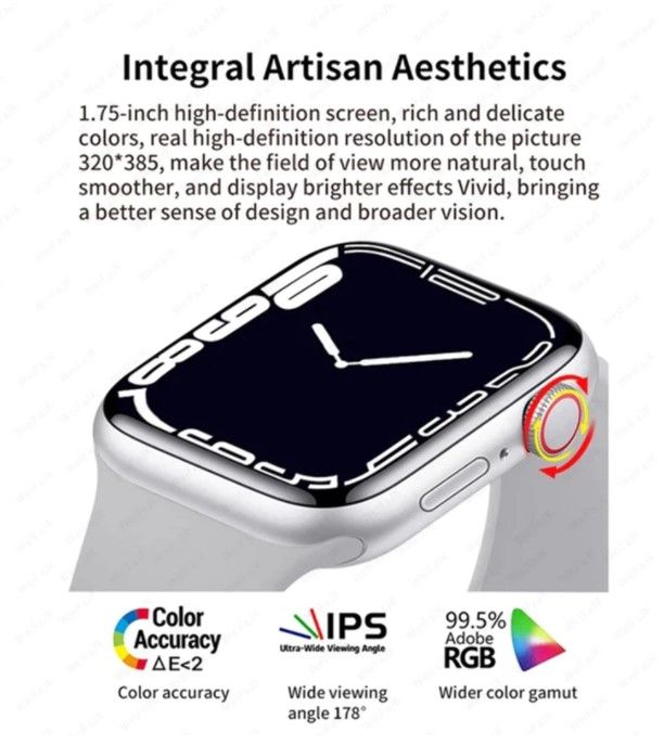 W37 Series 7 2021 New Smart Watch For Apple Huawei Xiaomi APP name: WearfitPro Main selling points: IP68 waterproof 1.75 HD large screen Low-power dual-mode Bluetooth Watch face download Split Screen Password Bluetooth call Heart rate Pedometer exercise more notification Product information: .CPU: Hs6621 .Size: 44*38*10.8MM .Bluetooth: Bluetooth 3.0+5.0 .Charging stand: strong magnetic charging cable .Environmentally friendly products: CE recognized qualified .Main screen: 1.75 inch TFT full circle screen, .Resolution 320*385 .Touch screen: Fully fit multi-touch .Battery specifications : 230MAH Features *Bluetooth push: synchronous display of incoming call, SMS, WeChat, QQ message content *Heart rate detection: supports 24-hour timing heart rate monitoring *Pedometer: exercise step count, calorie consumption, exercise mileage record *Sleep monitoring: objectively scientifically and quantitatively record and analyze your sleep status, automatically open from 9 o'clock every night to 9 o'clock the next morning *Vibration motor: support *Other functions: alarm clock, stopwatch Language: Watch support languages: Chinese, Traditional, English, Arabic, French, German, Spanish, Portuguese, Russian, Thai, Polish, Italian, Japanese, Turkish, Greek, Vietnamese, Hebrew, Persian APP language packs: Chinese, Traditional, English, French, German, Japanese, Spanish, Italian, Korean, Russian, Thai, Czech, Portuguese, Indonesian, Arabic, Turkish, Greek, Estonian, Bulgarian, Latvian, Lithuanian, Romanian, Serbian, Slovak Package includes: 1*smart watch 1*Packing box 1*Instruction NOTE: .This product supports IP68 waterproof, supports rain, hand washing and wearing. Hot showers or saunas cannot be worn to prevent water vapor. Water will accumulate in the speaker hole after soaking in water. Please shake the water out to return to normal sound. .When charging, the watch reverses, and the charging line is aligned with the contact point and it will automatically attract. It supports computer USB or mobile phone 5V standard charger, and it can be fully charged in about 150 minutes. .Please note that the two contacts of the charging cable cannot touch conductive objects at the same time, which will cause short-circuiting and burning.