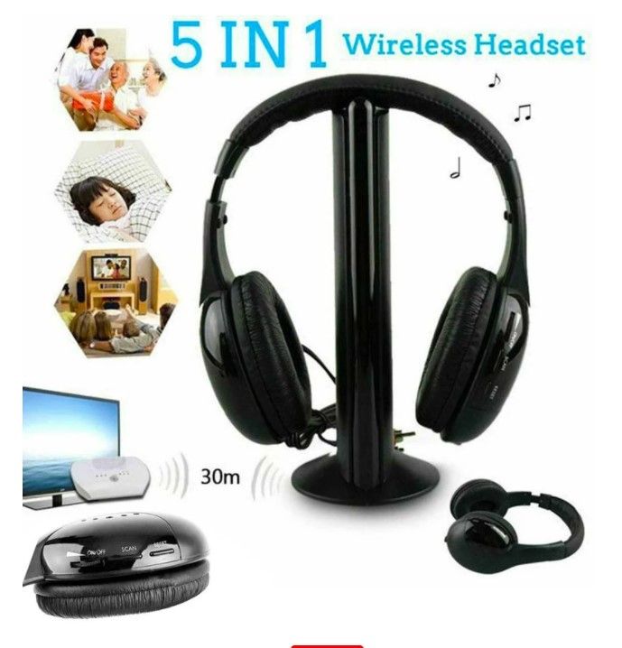 Five Features: 1 Wireless Earphone Wireless reception from any electrical device with audio output such as full-channel TV sound, PC, game player, DVD player, VCD player, audio device, MP3 player, and CD player. Full-channel TV sound: What will you do if there is your favorite TV program but you worry about disturbing others. Use of the wireless earphone enables you to watch wonderful TV program with mute function. 2 Wireless Net Chat Tool It\'s a perfect audio-chat tool, provides infinite enjoyment. 3 FM Radio The headset can be used as FM radio separately, which search and lock channels automatically. 4 Wired Earphone Equipped with audio cable, the receiver can be used as a wired earphone. 5 Wireless Monitor Place the emitter near babies, old people and sick people who need care, and the sound of the cared people can be heard from the receiver. Specifications: Receiver * Frequency range: 86-108MHz * Reception Mode: FM * Distortion: 2% * Power Supply: 2 * AAA batteries (not included) * Color: Black * Net weight: 170g Emitter * Emission Frequency: 840.5MHz * Modulation Mode: FM * Emission Distance: 30m (with no inference) * Reception from any audio and visual equipment with audio out socket, such as TV set, audio device, DVD/VCD player, multimedia PC, etc. * Power Supply: 2 * AAA batteries or 4.5 DC (not included battery and power cable) * Color: Black, White * Product size: 200*80mm (H*D) * Net weight: 135g Package: * Package dimensions: 215*207*87mm * Package weight: 487g Package including 1 * New Wireless Headphones 1 * FM Transmitter (stand) 1 * Audio Cable