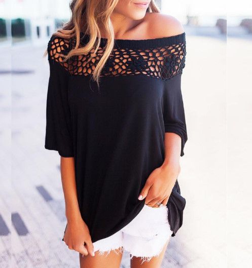 Model Number: women t-shirt Lace stitching oblique shirt