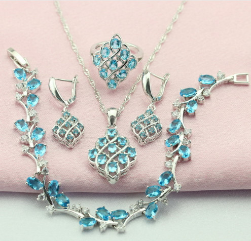 Jewelry Sets Type: Necklace/Earrings/Ring/Bracelet Style: Trendy Occasion: Wedding Gender: Women Shape\pattern: Geometric Metals Type: Silver Included Additional Item Description: Earrings/Necklace/Pendant/Ring/Bracelet Material: Cubic Zirconia Item Type: Jewelry Sets Fine or Fashion: Fashion Main Stone Color: Sky Blue Setting: Prong setting Gift: Free Jewelry Box is_customized: Yes