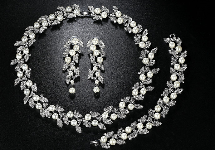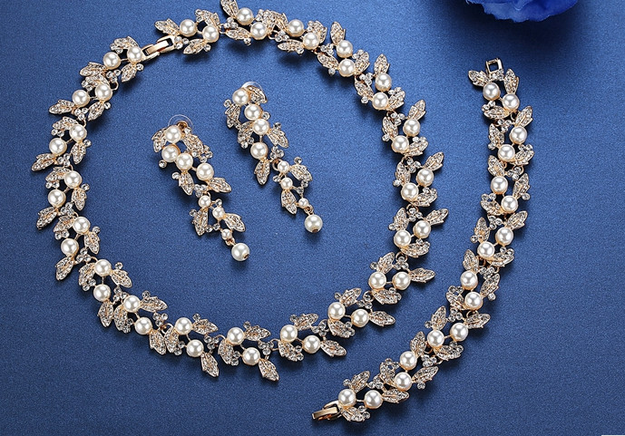 Item Type: Jewelry Sets Fine or Fashion: Fashion Shape\pattern: Plant Jewelry Sets Type: Bridal Jewelry Sets Style: Trendy Occasion: Wedding Pearl Type: Simulated-pearl Metals Type: Zinc Alloy Material: Pearl Gender: Women Included Additional Item Description: 1pcs necklace + 1 pair earrings + 1pcs Bracelet is_customized: Yes Environmental Standard: Lead Nickel Cadmium free Shape: Leaves, Round Other Stone: Rhinestone Shipping: Free shipping Color: Silver/Gold-Color Package: Bubble envelope