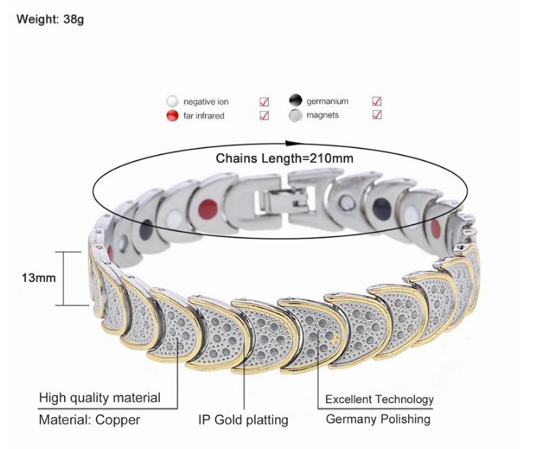 Healing 4 Elements Balance Health Silver Titanium Bracelet Magnetic Therapy for Natural Pain Relief THE BENEFITS OF NEGATIVE ION Increase your sense of well-being and mental clarity, To relieve tension, Improved energy levels and focus, Better sleep, Reduces instances of headaches and sickness, Elevated mental concentration and performance. THE BENEFITS OF FIR INFRARED Improve the immune system, Improve defense system, Slows down aging, Increases and maintains body warmth. THE BENEFITS OF GERMANIUM Strengthens one's immune system, Raises oxygen levels, Speeds up metabolism of body cells, Regulates positive and negative ions within the body, Removes harmful toxins, Controls swelling, Reduces water retention promotes quality sleep. MAGNETIC THERAPY Relive pain, Promote blood circulation, Optimum energy & stamina, Balance & harmony. Relieves fatigue and tiredness, Alleviates physical stress, striffness, cramps or discomfort. Relieves joint and muscle pain increases blood circulation. Item Type:Bracelets Metals Type:Copper Gender:Unisex Material:Magnetic bracelets Manual measurement:error is allowed Occasion:birthday gift Length:210mm Design:Magnetic Bracelet Shape design:Tortoise Shell Designer bracelets