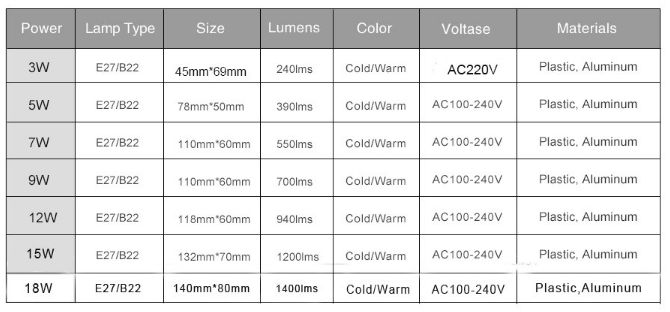 Wattage: 3W, 5W, 7W, 9W, 12W, 15W