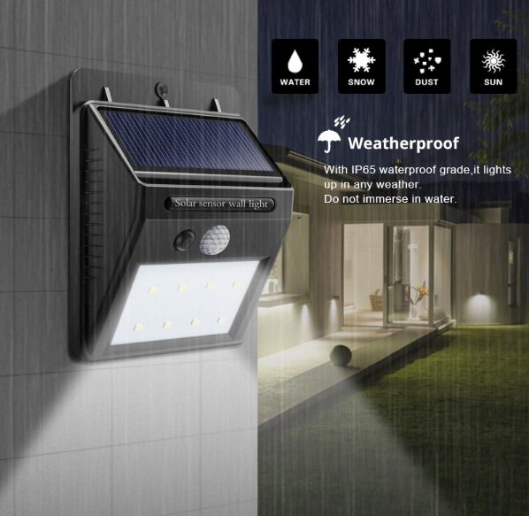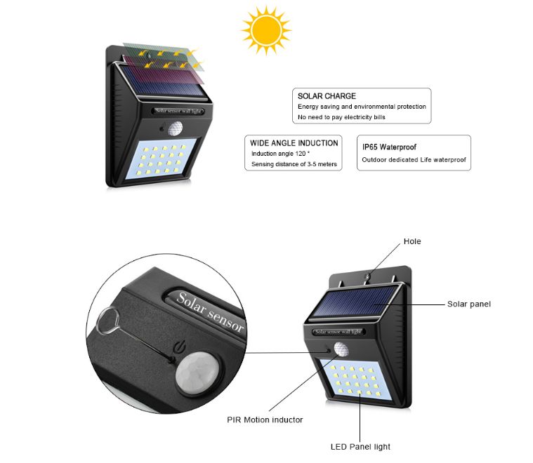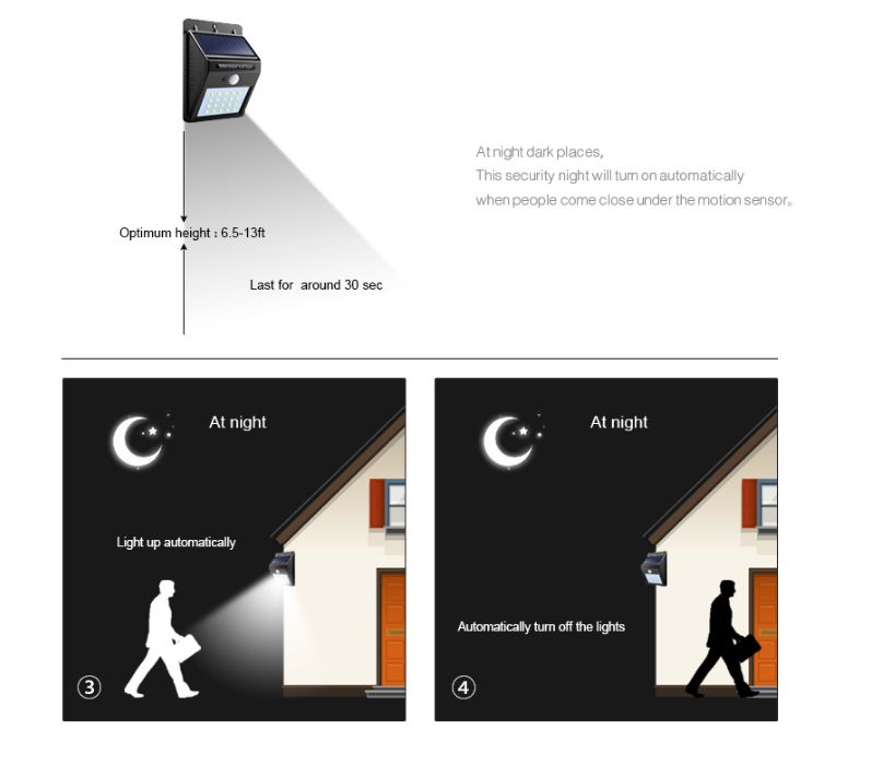 100% Brand New! Features: 2 sensors: Light sensor and and sensitive Motion sensor, energy saving. Solar Powered, easy for installation. Auto identify day or night. With waterproof function, and waterproof switch. Switch inside for saving power during shipment. Great useful lighting for your garden, yard, driveway etc. Charge by free sunlight and lights in the dark, sensing a movement at 10ft distance. Specifications: Solar Panel Power: 5.5V, 0.55W Lithium Battery: 3.7V-1200mAh LED: 20pcs 2835 Lamp beads Color Temperature: 6000-6500K Material: ABS Working mode: Infrared Sensor Charging time: more than 8 hours Working time: full of electricity, app 50 times a night, can work continuously for 4 days Intelligent standby power: < 0.05mAh Light: White Light Li-ion Battery Span Life: 500 circles Solar Panel Span Life: more than 5 years Package Weight: 0.17kg (0.37lb.) Package Size: 10cm x 5cm x 10cm (3.94in x 1.97in x 3.94in)