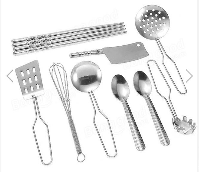 There are boiler,bowl,chopsticks,spoons,egg beater,colander and so on.