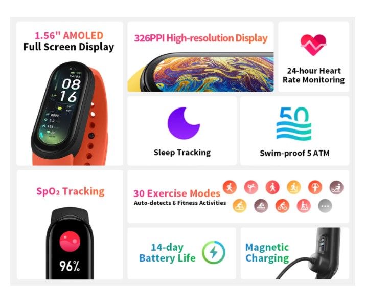[1.56’’ AMOLED] 1.56’’ AMOLED color screen, the screen is 50% larger than MI Band5(1.1’’).