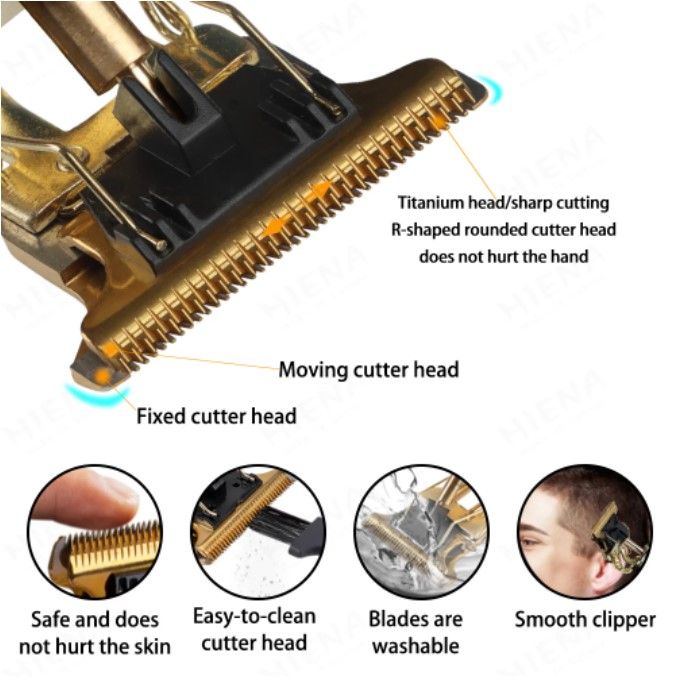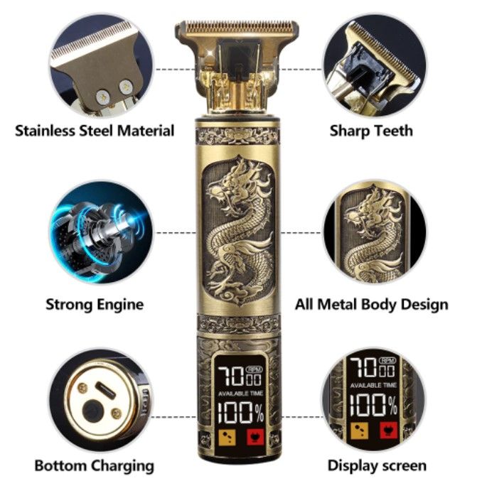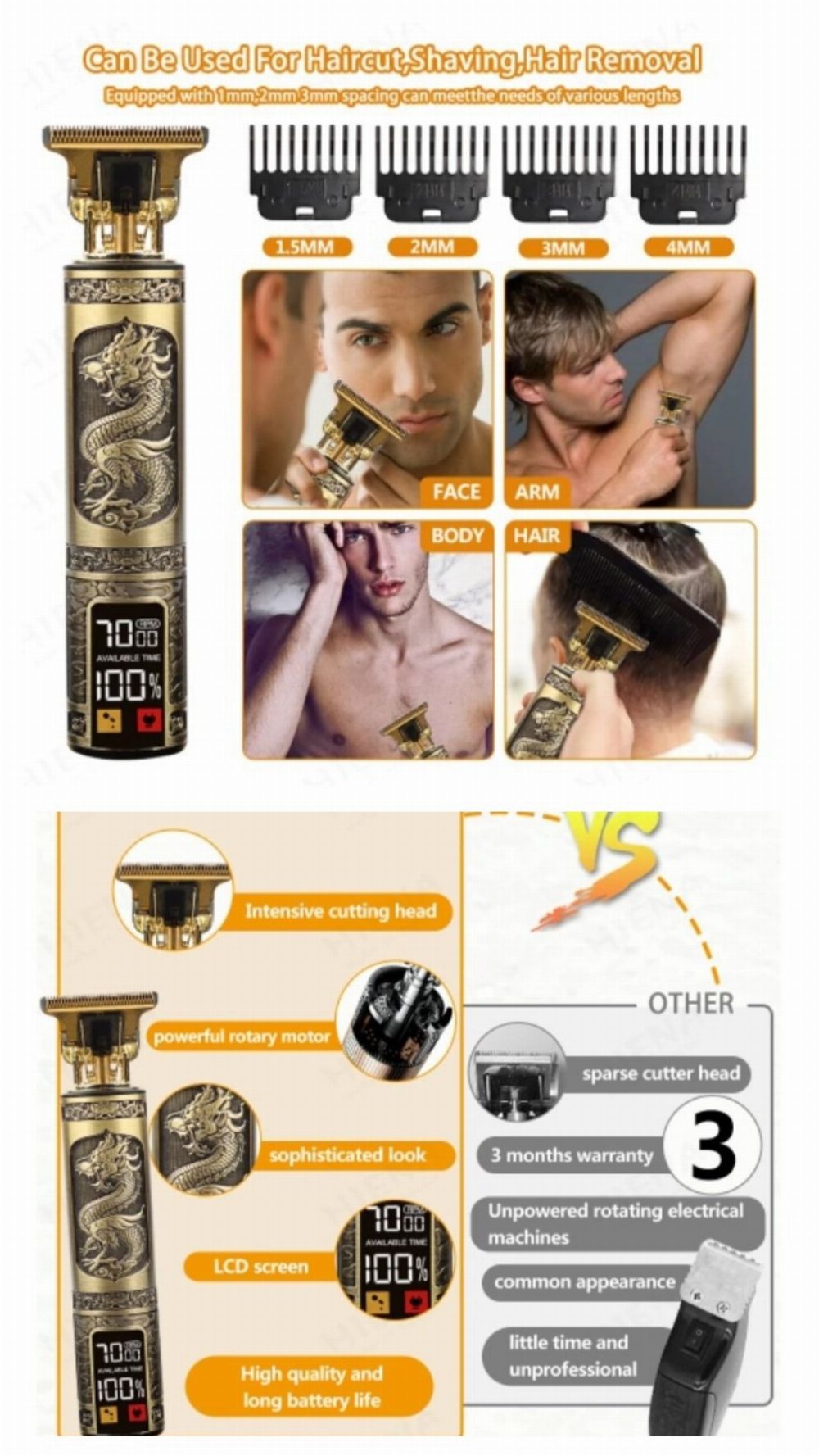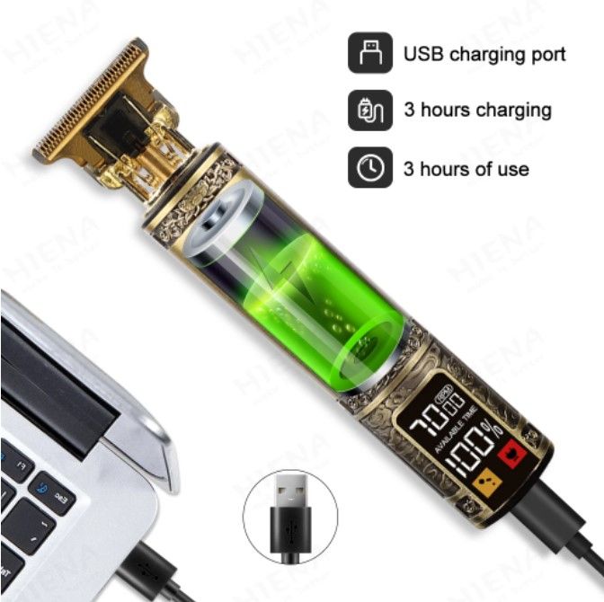 2022 New T9 LED Hair Clipper The all-aluminum body is engraved with exquisite patterns, the large LED screen displays the power, has 3-speed speed adjustment, and is equipped with Type C fast charging, it is your best choice for the new year! Product details: Product: rechargeable clipper Input Voltage: AC 110-240V 50/60Hz Charging time: 3 hours Useing time: 180min weight:about 240g Package list: 1Pcs* hair trimmer 1Pcs* brush 4Pcs* limit comb (1.5MM 2MM 3MM 4MM) 1Pcs*USB Charger Due to air transportation restrictions, liquids cannot be transported, so oil bottles are not included in the package, please be aware. Alloy cutter head + 4 limit combs The rounded design of the T9 head and positioning comb section ensures safe contact with the skin, protects the scalp from injury, is non-stick and non-irritating when cutting or shaving, provides accurate and consistent performance, and easily becomes your own hairdresser. USB charging + LED display Our hair clipper adopts a more convenient USB charging port, which makes charging more convenient and fast. The machine has a more comprehensive LED display, which can display the power and speed of the machine in real time Powerful motor + Ergonomic design Our clipper uses a powerful motor, stable and efficient, suitable for any type of hair. Anti-slip texture engraving design on the surface of the fuselage and one-button key design on the fuselage, easy to hold and control Big battery + Just the right size Using a 1500mAh large-capacity lithium battery, for example, a haircut is calculated by half an hour, twice a month, so this hair clipper can be used for 3 months with a full charge. Our hair clipper has a blade length of 40mm and a body length of 150mm, which is easy to carry and can be used for haircut, carving, oiling, shaving and other operations.