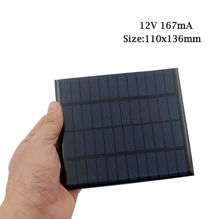 Standard Epoxy Polycrystalline Silicon DIY Battery Power Charge Module The product has high conversion rate and high efficiency output High quality with high light transmittance and unique technology make components beautiful and strong against wind and snow. It is easy to install and adopt specific technology to avoid freezing and deformation of the water in the frame. It is mainly applied to solar courtyard lighting, small household lighting street lighting equipment. It can also be applied to household low power appliances and DIY toys power supply, etc. Suitable for charging cellphone and small DC batteries Build your DIY powered models, solar display , solar light and solar toys, etc Product Specification: Color: Black Material: polysilicon +pet Power: 2W Voltage: 12V Material: Polycrystalline Size: 110x136mm Package Contents: 10 x Solar Panel