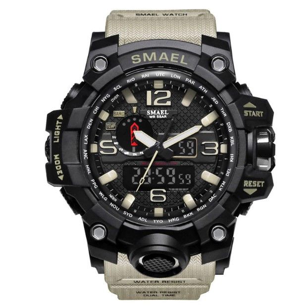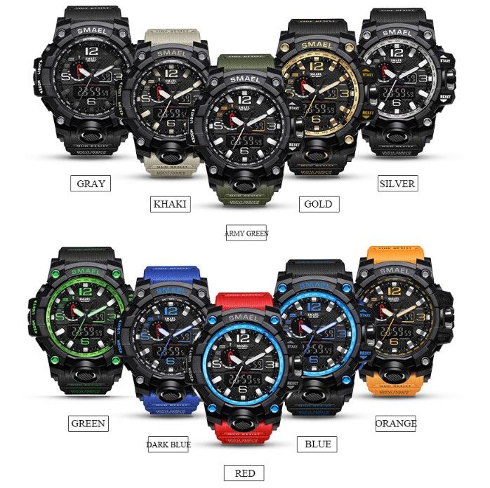 These new serious Military Watch with various colors ,s shock watches men military Just like its popular cool outlook ,this sport watch is fashion for men to wear daily or do sports. Function: - Type: Men Sport Watches/Causal Watches men watch big - Numeric dial, three hands dial made with the signature beautiful color which is associated with perfection. - Dual Movement with the latest breakthrough Japan Original Digital Movement, analog with LED displaying ,date, repeater, time Display, alarm, chronograph, water resistant, complete calender, LED display, Shock resistant, stop watch, back light function men watch brand luxury men watch fashion - Water resistant up to 5 ATM, 50M Water Resistant , Can Swim With It - Showing precise time - Men watch waterproof 1. Brand: SMAEL 2. Dual time shows with LED backlight function 3. 30M Water Resistant , Can Swim With It. 4. Type: Men Sports Watches 5. Movement: Japan Original Digital Movement 6. There are 10 colors for selection 8. Band Width: (approx) 2.1cm 9. Dial Diameter: (approx) 4.8cm 10. Strap Material: Strong PU 11. Case Material: Strong Rubber + High Strength Hardened Glass 12. Clasp: Buckle 13. Showing precise time 14. It is good gift for someone special Note: we suggest you not wear it when swim .but if you go to swim or dive , pls don't press any button underwater! Package Include: -1 * SMAEL Sports Watch -1* Instruction Card
