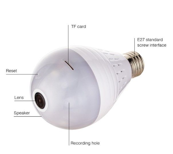 360° Panoramic view 360° panoramic monitoring without blind sports. Wireless connection, widely used in the room, office, store. Sensitive Motion Detection Algorithm Keeps You Safe On The Front Line. Precise Motion Detection Is The Camera'S Safety Hallmark. Any Slightest Movements Are Accurately Picked Up And Alert You Immediately. Integrated with LED illumination Support APP manually turns the light on/off. Camera and light bulb dual use, when you don't need to monitor, you can use as a light bulb. 2-Way Audio Keeps Your Loved Ones Feeling Comforter With Your Voice. Crystal Clear Speakers And Enhanced Microphone Preserves The Clarity And Novelty Of The Voice. It's Never Been So Easy To Stay Closer To Your Family. Wherever You Are.Dual Mode Audio; Choose Between Intercom Or Hands-Free For Your Audio Need. Support Up to 128GB Mirco TF Card Storage The TF card slot allows you to insert a 128GB Micro TF card, which means you can save images and videos for later viewing. Meanwhile, the large memory allows you to record everything you want without missing a moment. Widely used, simple to install. Standard E27 mouth, supports 110 - 220 V. Say goodbye to complex installations. Super easy install just like replace a bulb light. Internet connection around the world Where there is internet, there is your home. Dimensions (L x W x D)(mm):11cm*7cm*8cm Power Supply(V):110-230V Alarm Action:FTP Photo,Email Photois_customized:Yes IR Distance(m):10M Minimum Illumination(Lux):0.2LUX IR Pixel:1MP Supported Operating Systems:No Network Interface:Wi-Fi/802.11/b/g Power Supply:Normal Connectivity:IP/Network Wireless Installation:Ceiling Model Number:GV014-Bulb Camera Special Features:Vandal-proof Sensor:CMOS Type:IP Camera High Definition:1.3 Megapixels Power Consumption(W):6W Supported Mobile Systems:Android,iOS Style:Box Camera Lens (mm):1.44mm Viewing Angle (Degree):360° Video Compression Format:H.264 Wall Bracket:Ceiling Color:White Technology:Fisheye Bulb Lamp IP Camera Storage:Support up to 128GB Memory card Audio Output:Buli-in Mic and speaker Style:Bulb lamp camera Technology:P2P LED white light camera, wireless wifi Alarm:Motion detection alarm Bulb light day night vision:Support Feature:Support up to 128Gb TF, (TF card NOT included) Lens:Standard 360 degree VR lens Record mode:All day record, alarm record 960P WHITE LIGHT Wireless wifi camera With LED bulb light "960P White light camera " only has white light night vision 960P IR CAMERA Security IP Camera, Not support Mac "960P IR Light camera " has IR infrared night vision and white bulb light Package include: 1*Camera Bulb 1*User Manual