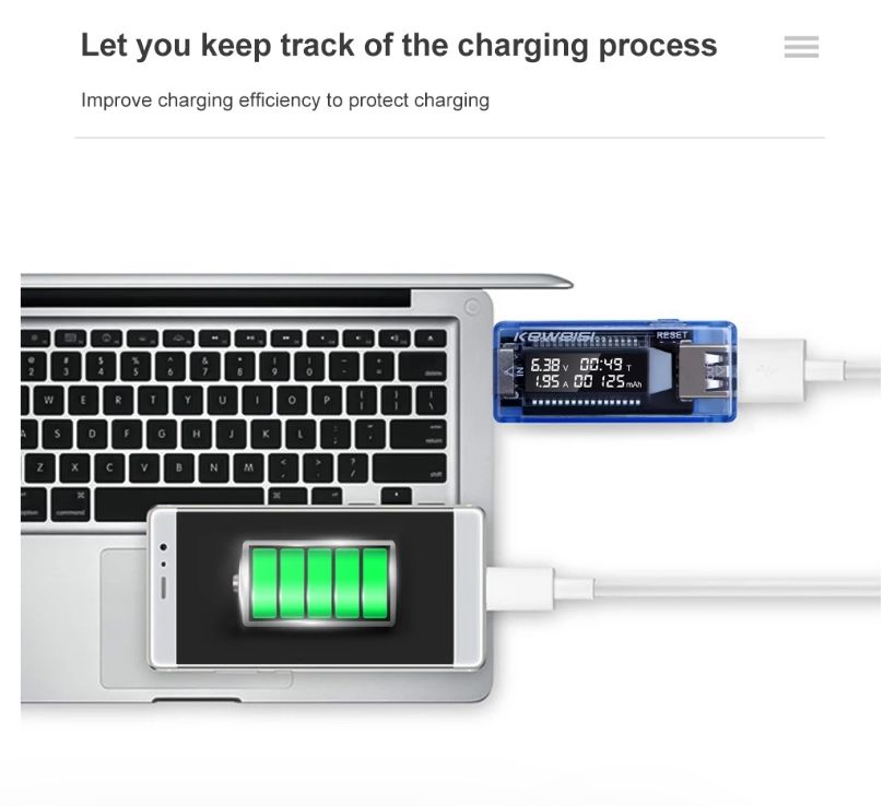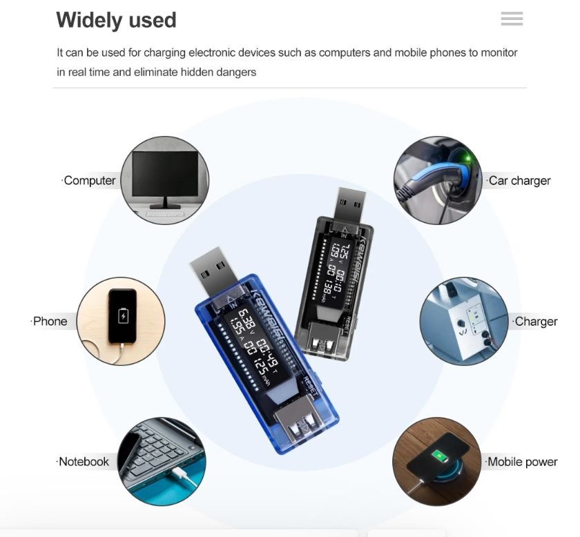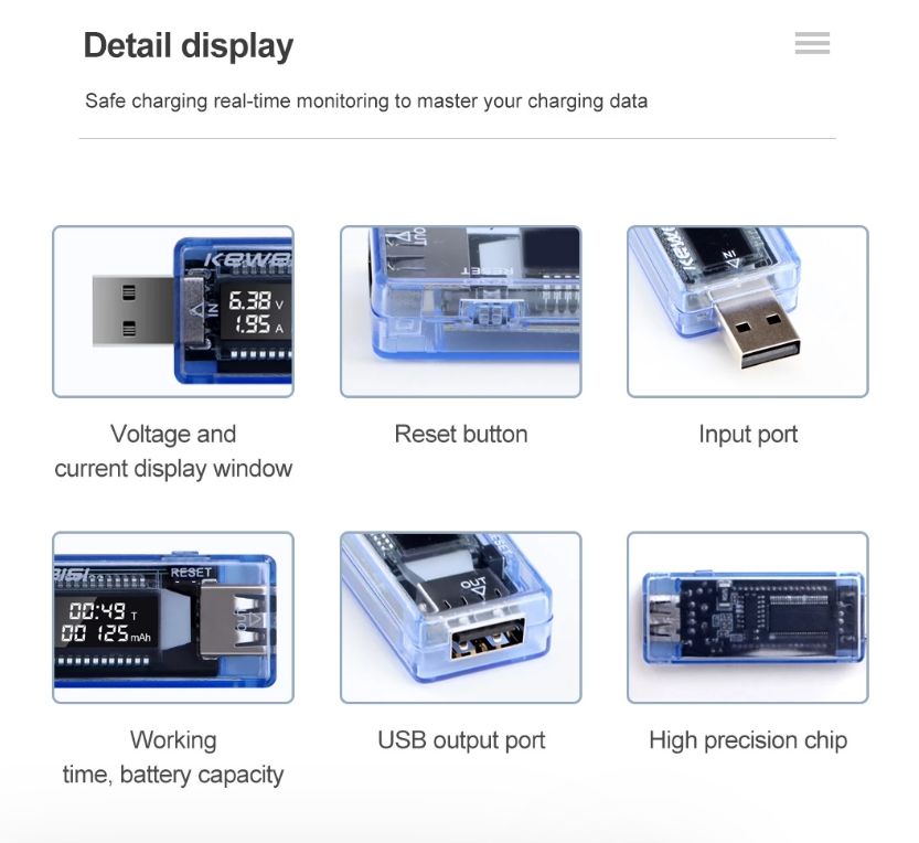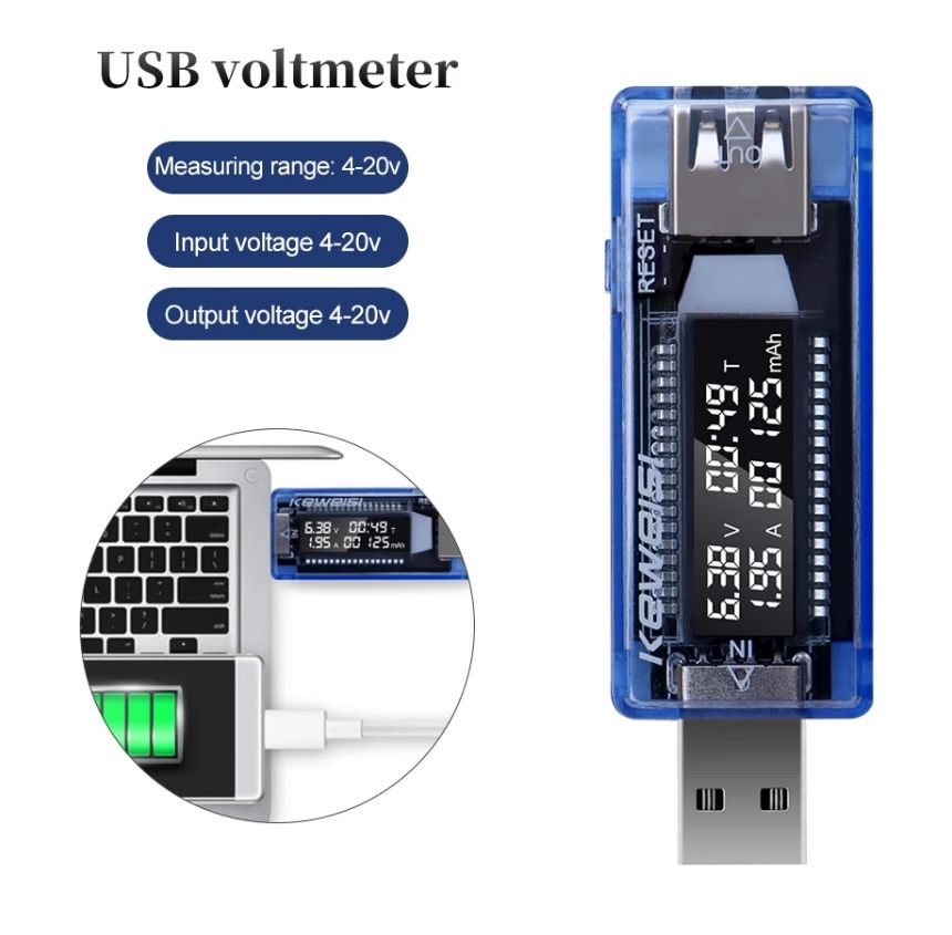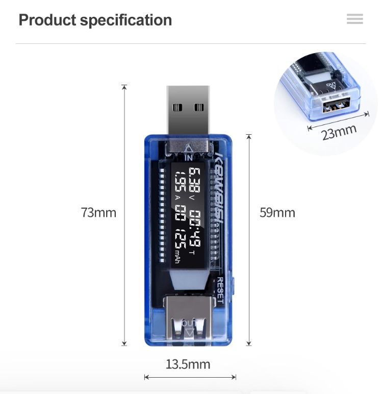 Feature: This is the mini USB meter. It can measure voltage, current, power and capacity. 0.91inch OLED Screen design. It is so lightweight which is so portable to be taken. Environmental protecting and low energy consumption. Over-voltage and under-voltage reminding for safe using. Perfect tool that is useful,helpful and so practical. Easy to use and to operate at affordable prices. Description: Voltage range: 3.5V-9V (1% accuracy) Current range: 0-3.3A (accuracy 1%) Working time (0-99Hour) Capacity measurement range:0-99999mAh Color: random Size:59*23*13.5mm Instructions for use: 1.Measuring voltage and current: Plug the USB male connector into the 5V charger, and the female connector into the mobile phone and other devices, and you can directly be alone in the voltage and current parameters 2.Test battery capacity: Use linear charging current such as TP4056 to charge the completely dead battery slowly through this capacity meter, and read the battery capacity in place. This method can also be used to measure the charging capacity of the mobile phone, and even calculate the charging efficiency of the mobile phone Test mobile power output capacity and efficiency: First connect this machine to the mobile power supply, turn on the mobile power supply, press and hold the button until the capacity data is reset to zero, insert the mobile phone to hide and charge until the mobile power supply is out of power and automatically shut down. The next time the machine is turned on, the displayed capacity is the mAH output by the mobile power supply. Note that this mAH is much smaller than the nominal mAH, output mAH*output power 5V/battery mAH*battery power 3.7V=mobile power efficiency 3.Data cleared: The screen display will be reset after pressing the reset button for 3 seconds. Note: 1. The IN-input terminal is connected to the output terminal of the charger. 2. RTZ- Clear button is pressed for 3 seconds and the screen display is cleared. 3. OUT- The USB port where the output end is connected to the data line. 4. Input voltage display window (3-9V) accuracy error 1%. 5. The accuracy error of the charging current display window (0-3A) is 1%. 6. Battery capacity display window (0-99999mAh). 7. Working time display window (0-99H) unit: minute. 8. Working time and capacity display after power off, there is memory function. Package Included: 1 * USB capacity voltage tester
