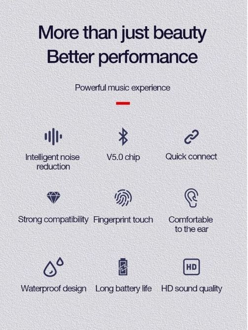 Product parameters: One button control easily to turn on / off, play / pause / music switch Hands free calling to drive, work, meeting, run. Smart compatibility: support all bluetooth cell phone, tablet, notebook, qq music, movies, etc., universal all mobile phone. Parameters: 1.Bluetooth Transmission Range: 10 Meters 2.Operation Mode: Smart Touch 3.Compatible: Android, iOS, Microsoft, Tablet, 99% of the phones with Bluetooth. 4. The Left And Right Ears Can Be Used Separately And Can Be Independently Matched With Bluetooth Devices 5. Smart Touch Design, Easy To Operate Vocalism Principle:Dynamic Control Button:Yes Function 1:Operation Range 10 Meters; Bluetooth V4.1; With Microphone Function 2:2 Hours Charging Time; 100 Hours Standby Time Function 3:60mAh Battery Capacity; Up to 6 Hours Talk / Music Time Suitable:For Apple iPhone X 8 7 Xiaomi mi Sony Samsung Huawei Meizu 🙆Tips: When purchasing a tws Bluetooth headset, please read the following instructions: Due to long-term transportation, the power of the tws headset will be exhausted. After receiving the package, you will not be able to use the headset, and it may be powered off. The first thing to do is to remove the blue protective film under the earphones and charge the earphone box for 30 minutes. Very important. Thanks! When the earphones is connected for the first time, if it is not operated correctly, the earohones may not be successfully paired. It will cause only one of the earphones to make a sound, but not both. Please follow the steps below to solve the problem. 1.take out from the charging case 2.turn one earphone 3.the red and blue lights flicker alternately, ,the light won't flash after 3 seconds 4.Turn on Bluetooth on your phone or other device 5,you can hear the ”connected“ after the connection is successful