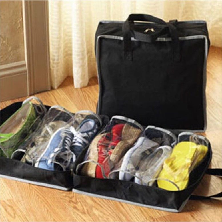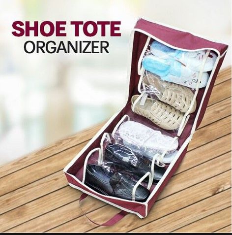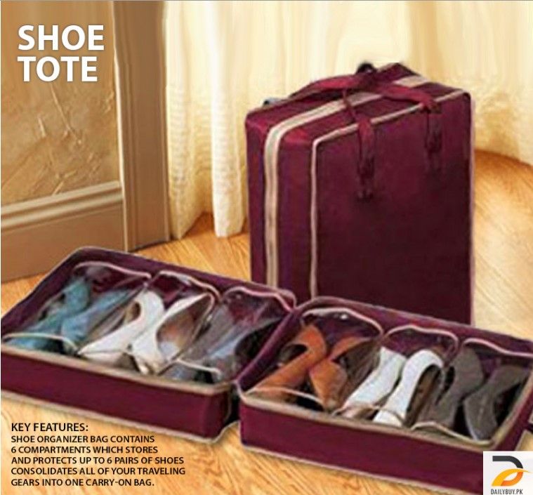 PORTABLE SHOE TOTE STORES & PROTECTS UP TO 6 PAIRS OF SHOES GREAT FOR PROTECTING YOUR SHOES SAY GOODBYE TO CLUTTERED CLOSETS FULL OF MESSY SHOES USE IT UNDER ANY BED PORTABLE, TAKE IT ON ANY HOLIDAY, VACATION OR SLEEPOVER A MUST HAVE ITEM Feature: 100% brand new and high quality. Quantity: 1PC Material: Non-woven + PVC Size:38X33X19cm Color: random (black, wine) Package Content: 1PC Portable Shoes Travel Storage Bag Organizer Tote Luggage Carry Pouch Holder