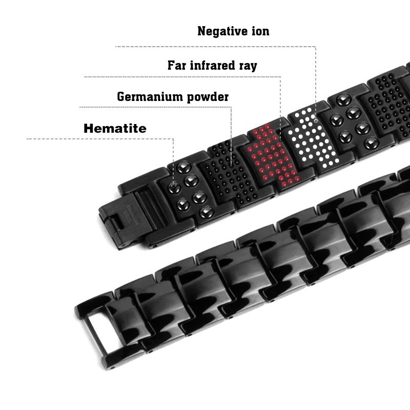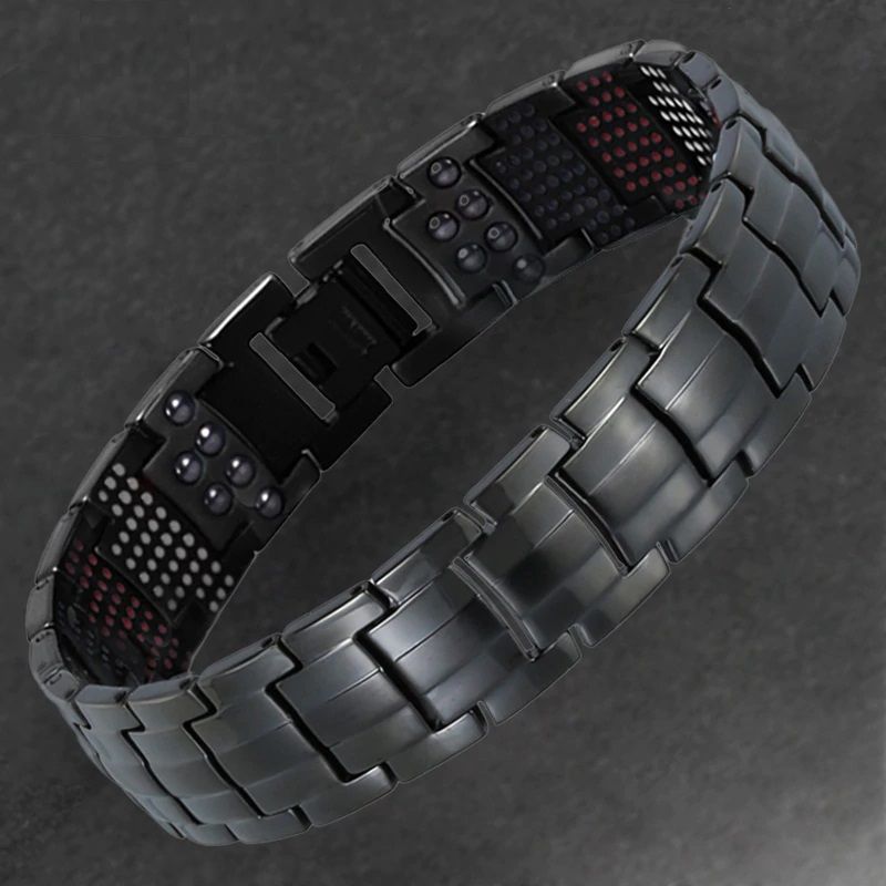 Trendy Black Titanium Health Bracelet for Men Features : - Magnet can improve the body's immune function, mainly used to relief dizziness, palpitation, insomnia, irritability and dreaminess. -Far infrared ray can promote the growth and health of living cells. It can be accelerate blood circulation, adjust blood pressure, improve arthralgia, adjust autonomic nerve, promote metabolism. -Negative ions can improves sleep quality, increase the oxygen content, and is beneficial to oxygen transmission, absorption, and utilization. -Germanium powder can shields the electromagnetic radiation in our daily life. Adjusts blood pressure, reduce fatigue Specifications : Material : Ta2 Titanium Length : 21CM Width : 1.5CM /0.9CM Colors: Silver/Black/Gold Health Energy Elements: Magnet/Far Infrared Ray/Negatives Ions/Germanium Powder Fuctions: Antifatigue&Radiation Protection And So On Gender: Women/Men/Unisex/Lovers Occasions: Birthday gift/anniversary/wedding/Party Note: Please allow manual measurement error of 0.1-0.3 cm