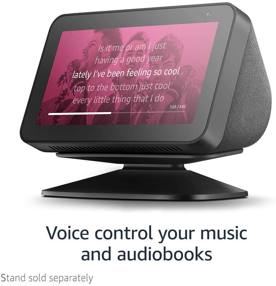 The Echo Show 5 brings you everything you love about Alexa, in a stylish and compact design that can show you things. Just ask to see the weather, cook along with recipes, get the news with a video flash briefing, create routines and alarms to start your day, see lyrics with Amazon Music, manage your calendar, browse and listen to Audible audiobooks, and much more. You can even personalize your Show with a collection of clock faces to suit your style or set a photo background from Prime Photos. Plus, make voice or video calls with friends and family or make video calls to anyone with a compatible Echo, Alexa App, or Skype. Echo Show 5 also lets you control your privacy with the mic/camera off button or the built-in camera shutter. In addition, the Show's far-field technology (four microphones, beamforming technology, and enhanced noise cancellation) can hear your commands and requests from across the room—even while music is playing! A GREAT GIFT! See and do more with Alexa Echo Show 5 connects to Alexa to give you vivid visuals on a 5.5-inch screen with a crisp full sound—all in a compact design that fits in any room, in any home. See on-screen lyrics with Amazon Music. Set alarms and timers. Catch up on news highlights and movie trailers. Check weather and traffic as you head out in your new city. Entertainment for every part of your day Catch up on today’s news and sports highlights. Watch TV shows, movies, and trailers. Cook along with step-by-step recipes. See song lyrics and album art with Amazon Music. It’s the perfect size for adding glanceable entertainment to any room. Connect with your favorite people Make hands-free video calls to the Alexa app or another Echo device with a screen. Instantly connect to other supported devices in your home, or make a voice announcement to every room with a supported Echo device. More ways to control your privacy Alexa and Echo devices are built with multiple layers of privacy. For example, your voice is streamed to the cloud only after your device detects the wake word (“Alexa”). You can also turn the microphone and camera off with a press of a button. And the built-in shutter lets you easily cover the camera. Make your home smarter Manage compatible smart home devices on the simple interactive display or use your voice. Control lights and switches. Set thermostats. View security cameras. Make other nightstands jealous Use the ambient sunrise lighting feature to get your day started right. You can also choose from several fun clock face designs or display albums from Amazon Photos. Alexa has Skills With more than 80,000 skills and counting, Alexa is always getting smarter. Skills are like apps and help you do more like play Jeopardy! or learn something new with wikiHow. Just say, "Alexa, show me skills." SPECIFICATIONS Size: 5.8 inch x 3.4 inch x 2.9 inch (148mm x 86mm x 73mm) Weight: 14.5 oz (410 grams) Display: 5.5 inch touchscreen Camera: 1MP camera with built-in shutter Wi-Fi connectivity: Dual-band Wi-Fi supports 802.11a/b/g/n/ac Wi-Fi networks. Does not support connecting to ad-hoc (or peer-to-peer) Wi-Fi networks. Bluetooth connectivity: Advanced Audio Distribution Profile (A2DP) support for audio streaming from your mobile device to Echo Show 5 or from Echo Show 5 to your Bluetooth speaker. Audio/Video Remote Control Profile (AVRCP) for voice control of connected mobile devices. Hands-free voice control is not supported for Mac OS X devices. Bluetooth speakers requiring PIN codes are not supported. Audio: Full range 1.65 inch built-in speaker. 3.5 mm stereo audio output for use with external speakers (audio cable not included) Alexa App: The Alexa App is compatible with Fire OS, Android, and iOS devices and also accessible via your web browser. Certain skills and services may require subscription or other fees. Wi-Fi Connectivity: Dual-band Wi-Fi supports 802.11 a/b/g/n (2.4 and 5 GHz) networks. Does not support connecting to ad-hoc (or peer-to-peer) Wi-Fi networks. Bluetooth Connectivity: Advanced Audio Distribution Profile (A2DP) support for audio streaming from your mobile device to Echo Spot or from Echo Spot to your Bluetooth speaker. Audio/Video Remote Control Profile (AVRCP) for voice control of connected mobile devices. Hands-free voice control is not supported for Mac OS X devices. Bluetooth speakers requiring PIN codes are not supported. Audio: Built-in speaker. 3.5 mm stereo audio output for use with external speakers (audio cable not included). Alexa App: The Alexa App is compatible with Fire OS, Android, and iOS devices. A list of supported operating systems can be found here. Accessibility Features: On Echo devices with screens, you can enable Alexa captioning and closed captioning, magnify the screen, toggle color inversion, and choose between color correction options. You can also enable the VoiceView screen reader to use gestures to navigate the screen and hear spoken feedback about the items you select. Privacy Features: Wake word technology, streaming indicators, microphone/camera off button, built-in camera shutter, the ability to view and delete your voice recordings, and more. Visit the Alexa Privacy Hub to explore how Alexa and Echo devices are designed to protect your privacy. In the box: * Echo Show 5 * Power adapter (15W)/cable (4.9 ft.) * Quick start guide and Things to try card