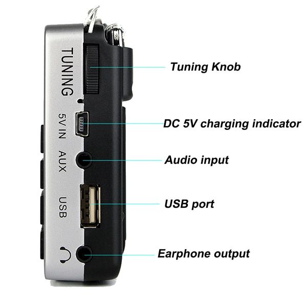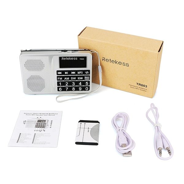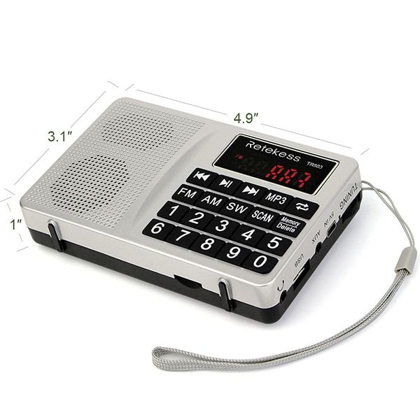 Retekess TR603 AM FM Radio Shortwave Transistor Digital Tuning Receiver MP3 Player Support TF Card Rechargeable Li-ion Battery Color: As Picture Features: 1. Two independent knobs for volume and tuning control; advanced large soft button radio for easy operation. 2. 3.5mm AUX input; audio output function for Ipad; MP3; MP4 player; Iphone and other mobile phones; easy to insert foriPod; mobile phone; tablet; laptop and other MP3 players or any audio source. 3. The last rechargeable 1000mA (non-800) lithium battery support is better; LED screen; large buttons and portable size make this radio a convenient companion in your daily life. 4. Equipped with high quality 5W high power speaker and bass diaphragm; 180g/ 0.4lb; 4.9 x 3.1 x 1", suitable for home use; outdoor; office and other convenient places; ideal for walking; hiking; camping; 5. Short-wave transistor radio with 21" antenna supports better reception; removes preset radio function; you can enjoy personal radio time plugged into 3.5mm headphone jack. Specifics: 1. FM/AM/SW radio: TR603 has FM AM SW 3 band radio, you can search for your favorite band to listen. 2. MP3 player: can play music files stored in TF card and USB, support fast forward/rewind, song loop, etc. 3.HEADSET:Equipped with 3.5mm headphone jack,you can enjoy personal music or broadcast time. 4. Knob: The easy-to-operate high-sensitivity radio button makes it an ideal choice for us. 5. AUX input: Built-in 3.5mm AUX, the audio output function is suitable for MP3 players such as ipad laptops or any audio source. 6. Sound quality: equipped with a high-quality 5W high-power speaker and bass diaphragm. 7. Lithium battery: Built-in 1000mAH lithium battery, which can be recharged and has a long battery life. More Details: Frequency : FM: 87.5-108 MHz, AM: 522-1710 KHz SW: 2.3-21.95MHz Power : 1000mAh lithium battery (included) Audio Format : MP3 Charging voltage : DC 5V, 500Ma 3.5mm earpiece jack Size : 4.9 x 3.1 x 1 in Weight : 0.4lb Package include: 1 x TR603Radio 1 x lithium battery 1 x USB changing cable 1 x AUX cable 1 x English Manual