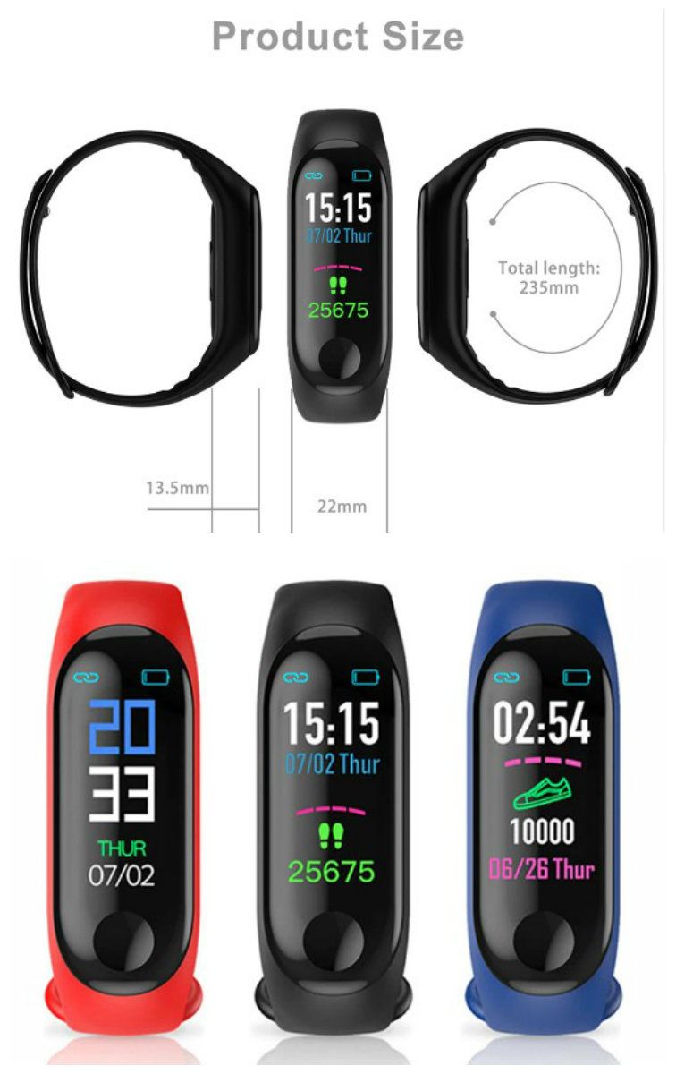 Product description: * 0.96'' IPS 160 * 80 resolution color screen * IP68 waterproof (you can wear it in the rain, wash your hands, but don't put it in hot water) * Built-in 105mAh battery, charging time is about 1.5H, normal use time is about 10 days, standby time is about 20 days *Bluetooth push support (call, SMS, application news alert: QQ, Facebook / Twitter / WeChat, etc.) * Support heart rate / blood pressure / blood oxygen monitoring (this function is for reference only, can not be used for medical data) *Pedometer (sports step, calorie consumption, exercise mileage record) * Support multiple sports modes (running / riding / climbing / swimming / ping pong / walking, etc.) * APP name: ''Lefun'' * detachable shoulder strap * Charging mode: USB dedicated charging cable *Compatible system: BT4.0, for Android4.4 and IOS8.0 or higher *Main features: sedentary reminder, multi-sport mode, full font push, WeChat campaign, weather forecast, reject call, search device, alarm reminder, photo, drinking reminder, gesture control, do not disturb mode, reminder mode, sleep monitoring , G-sensor * APP supports 10 languages: Simplified Chinese, English, German, Russian, French, Portuguese, Spanish note: Please do not read it compared to hospital equipment, it is not a medical device! Before using, scan the QR code on the manual to download the app and connect it to the watch via the app. package: 1*smart wristband 1* instruction manual Note: This is not the Xiaomi Band 3. The smart wristband is not for medical use, please do not buy to check health (heart problems, blood pressure problems). It is not suitable for professional use. Just refer to it.Note: This is not the Xiaomi Band 3. The smart wristband is not for medical use, please do not buy to check health (heart problems, blood pressure problems). It is not suitable for professional use. Just refer to it.