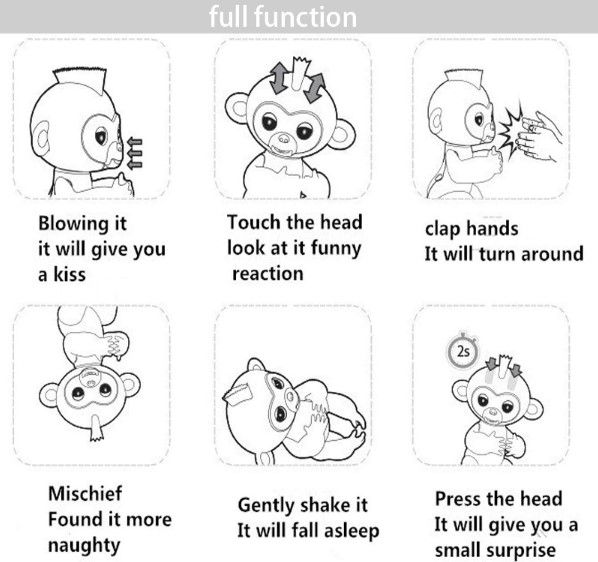 Boris is my name and laughter is my game! Boris is a blue monkey with soft orange hair who loves hanging onto your finger and knows when he is being pet, talked to, and even hung upside down! Fingerlings are adorable baby monkeys that are curious about the world around them—starting with you! These interactive pets love to hang onto your finger, blink their eyes, turn their heads, blow kisses, swing by their tails, and talk in monkey babble! They come in a variety of colours including white, black, pink, purple, blue and turquoise. Adopt them all and have even more fun monkeying around FRIENDSHIP AT YOUR FINGERTIPS With Fingerlings, fun is always close at hand. Literally! These miniature baby monkeys cling to your fingers and go where you go. They’re full of hugs, love and mischief—all they need is your care and attention. They react to sound, motion and touch, make fun little monkey noises, and move in ways that will make you squeal with delight. Friendship really is at your fingertips! COMPANIONS THAT COME TO LIFE With over 40 animations and SFX, these adorable newborns are a lively bunch. Clinging to your finger is only the beginning! They also make kissing sounds, chatter away in monkey babble, open and close their eyes, hang by their tails and more. Discover all of the fun, wild and wacky ways that they respond to your touch and voice. SWING THEM. These little babies are monkeys after all, and they love nothing more than hanging by their tails. See what responses you activate when you turn their world upside down. PET THEM. Give your baby monkeys some tender loving care, and they’ll soak it right up. From soft cooing sounds to happy eye blinks, you’ll see that a little love can go a long, long way. ROCK THEM TO SLEEP. Baby monkeys need their naptime. Cradle them in your hands, rock them to sleep and watch them drift off to dreamland. Applicable age: 6 years old or older Main material: ABS environmental protection material Product weight: 0.15kg Function: Smart sensor, touch interaction About the product 1.Bella is my name, and I love to grab onto things... especially your fingers! 2.Fingerlings respond to sound, motion, and touch with blinking eyes, head turns, and silly monkey babble. 3.Blow them kisses and they will kiss you back! 4.Hang them upside-down by the tail and watch them monkey around! 5.Pet them to sleep or make a loud noise and watch them get excited! Warm Tip: This product is not suitable for children under 3 years old, in case of accidental swallowing small parts