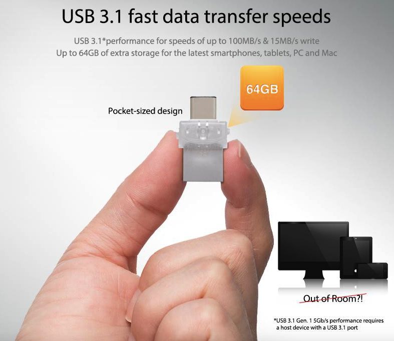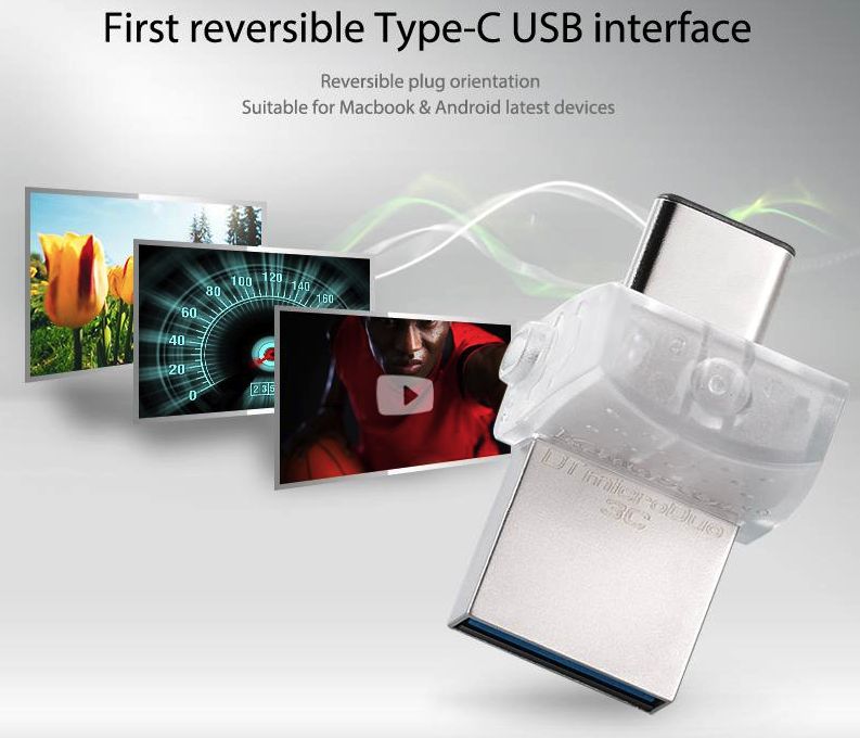 Kingston’s DataTraveler Type-C USB drives provide storage in a small, convenient form factor for devices with USB Type-C ports. These Flash drives are also compatible with existing USB 2.0 and 3.0 Type-A ports found on PCs, tablets and other devices. NEW GENERATION DataTraveler microDuo 3C Features: Capacities1: 16GB, 32GB, 64GB Speed2: USB 3.1 16GB — 100MB/s read, 10MB/s write 32GB, 64GB — 100MB/s read, 15MB/s write Dimensions: 29.94mm x 16.60mm x 8.44mm Operating Temperature: 0°C to 60°C Storage Temperature : -20°C to 85°C Performance: https://youtu.be/p458Suqk4t0 (copy and paste to your browser) What is USB 3.0? USB 3.0 is the next major revision to the Universal Serial Bus (USB). It offers the same ease-of-use and plug and plays capabilities as previous generations of USB technologies but with a 10X performance increase and better power management. For users of USB 3.0, the goal of connecting devices to PCs or notebooks is still the same as the USB 2.0 specification. Why do you need that much speed? USB 3.0 helps you save more time and USB 3.01 drive transfers files faster than USB 2.0 drives. Depending on the number of channels the transfer speeds and the type of files you transfer, USB 3.0 can save you a lot of time compared to standard USB 2.0 drives. Why do I need a USB 3.0 drive when I use only USB 2.0 ports? Due to the broad deployment of USB 2.0 devices in the market, USB 3.0 devices had to be backward compatible. Even when you use USB 3.0 drives on your USB 2.0 host devices, you'll save time. Will a USB 3.0 drive work on my device with USB 2.0 ports? USB 3.0 devices are compatible with USB 2.0 and USB 1.1 ports and connectors but will only run at the host device performance. USB 3.0 devices will, however, help to maximize the throughput of USB 2.0 ports. Compatible with: Windows® 10, Windows 8.1, Windows 8, Windows 7 (SP1), Windows Vista® (SP2), Mac OS X v.10.8.x+, Linux v.2.6.x+, Chrome OS™