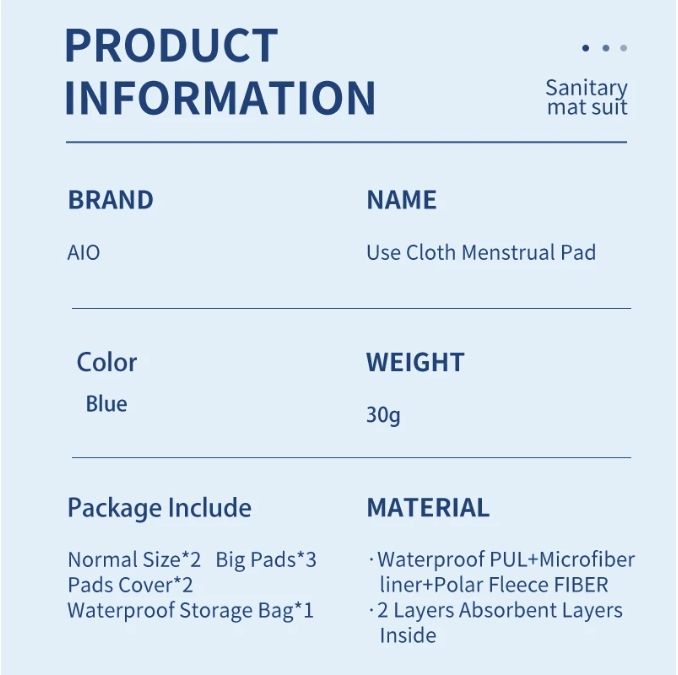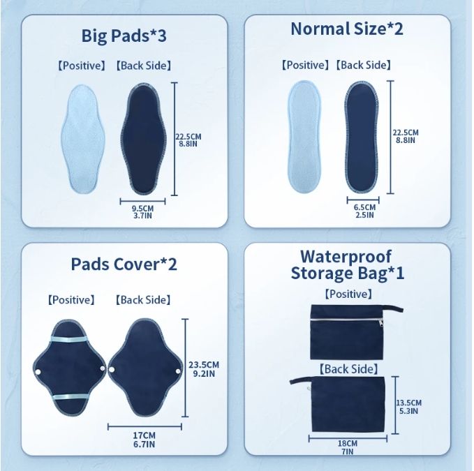 Material: Polar fleece Size: 3pcs Pads,22.5*9.5cm(9*3.8Inch);2Pcs Pads,22.5*6.5cm(9*2.6Inch),2Pcs Pads Cover,23.5*17cm (9.4*6.8 Inch) Item Type: Feminine Hygiene Color: Blue Outer Material: 1 Layer Of Waterfowl PUL Inner Material: 2 Layers of MICROFIBER Durable, Waterproof, Super absorbent, Washable, Reusable, Easy to wash And Dry, Fashionable, Comfortable, Environmentally friendly.
