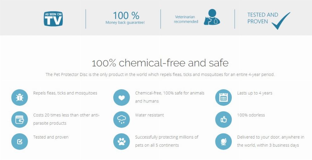 What is Pet Protector? The Pet Protector Disc is a one-of-a-kind product available on the market, committed to the prevention, protection and defense of pets against external parasites – ticks, fleas and mosquitoes. Pet Protector represents the greatest scientific discovery in the Pet Industry and is very unique, because: of the way it works it's 100% safe for animals and people (non-chemical) its effects are long-term (4 years) it’s very easy to use it's effective on different types of animals (dogs, cats, horses, sheep, etc.) How does Pet Protector work? To properly understand how Pet Protector works and what it means for you and your pet, let’s take a brief look at the other solutions that are widely available on the market. Today’s chemical and pharmaceutical industries sell various products which help pets and their owners in the battle against ticks and fleas – liquids and powders, spot-on treatments and collars. How efficient these products are varies greatly but the one thing they have in common is that all of these products eliminate parasites in the same way – with the help of different chemical substances – toxic insecticides. As a result, an absurd situation arises, one with tragic consequences: by solving one issue, we create another, much greater problem. Poisonous and cancerous materials (such as pyrethroids), found in these products, have systematically toxic effects on the animal’s entire body, especially on the blood cells, liver and nervous system. They are not only harmful to the health of the animal, but they are also harmful to people, children especially who often cuddle their pets, touching fur which is covered in these insecticides and then, without washing their hands, they touch their own eyes and mouth. The main problem is that pets are unable to speak up when they don’t feel well. We can only imagine the kind of terror and pain these poor animals must go through when they are repeatedly exposed to these insecticides, which penetrate through their skin, entering their bloodstream. Pet owners are unable to see that their animal is suffering in the very beginning, however, by the time the problem becomes obvious, it is usually too late. The Pet Protector Disc is not a chemical product, its effectiveness at repelling ticks, fleas and mosquitoes is based on something entirely different. This is what makes it so unique. The Pet Protector Disc is made of high quality steel alloys. It is charged with a specific combination of Magnetic and Scalar waves, which after being triggered by the animal’s movement (blood circulation), produce an invisible energy field around the entire animal’s body. Pet Protector’s Scalar waves are totally harmless to people and animals (they go absolutely undetected by humans and animals alike) and they are only effective against external parasites, repelling them from the shielded area. Therefore, the Pet Protector Disc acts preventatively; it drives fleas, ticks and mosquitoes away before they get the chance to infest your pet, versus all other anti-parasite products, which kill external parasites after they have already infested your pet.